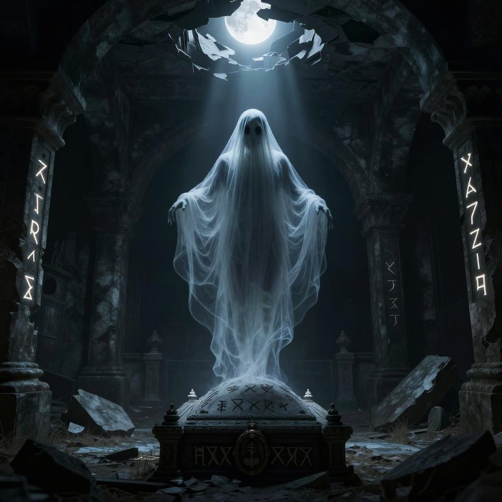 Pale from the crypt, a translucent ghost with hollow eyes floating above a crumbling burial chamber, moon beams piercing through broken stone ceilings, ancient runes glowing faintly, mysterious and ethereal ambiance with a touch of gothic horror.