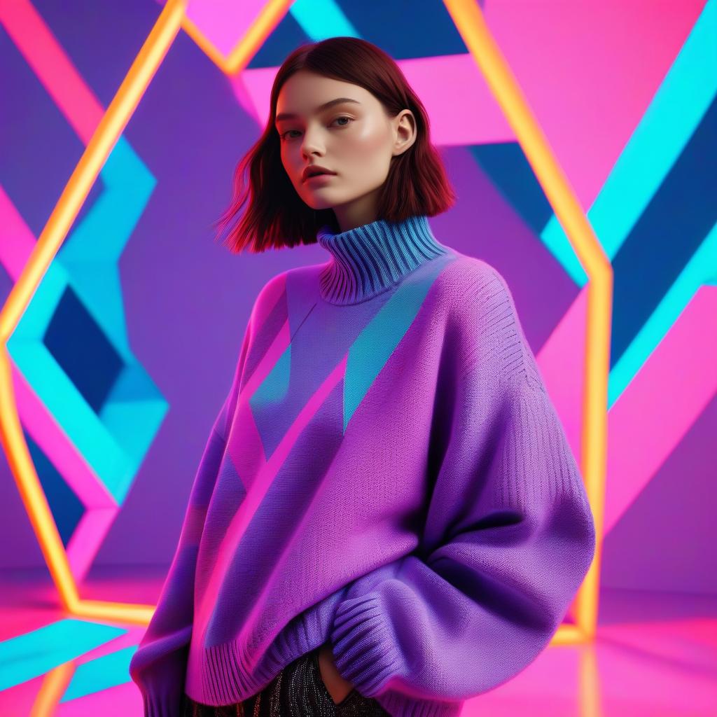 Stylized full-length depiction of a young woman dressed in oversized sweater by Lotta Volkova, posed against a geometric neon backdrop, with a bold aesthetic, high fashion editorial style.