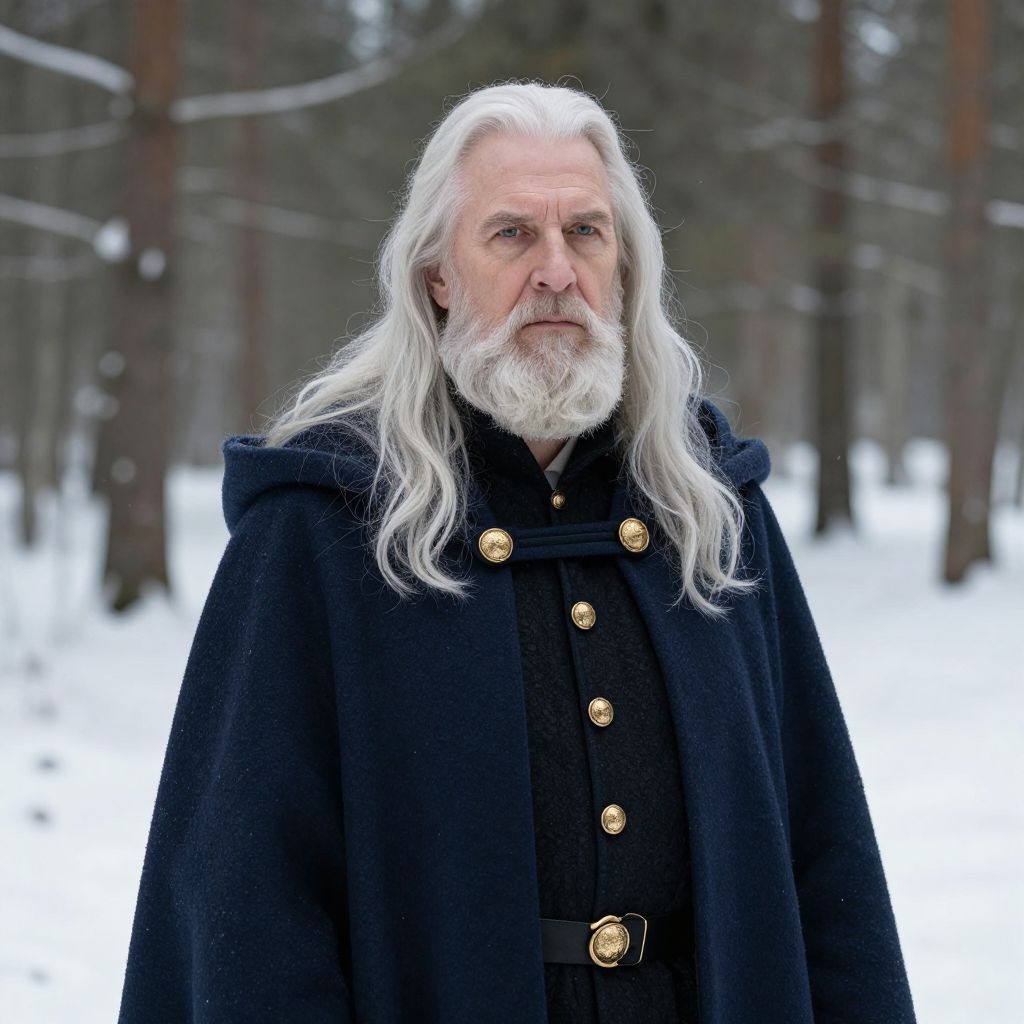 A photograph of an older white man with long, flowing white hair and a full white beard, standing in a snowy forest. He's wearing a thick, dark blue cloak with gold buttons, and a black inner garment. His expression is serious and slightly stern. The blurred background shows tall trees with a snowy, wintry landscape. The overall vibe is mystical and somewhat regal.