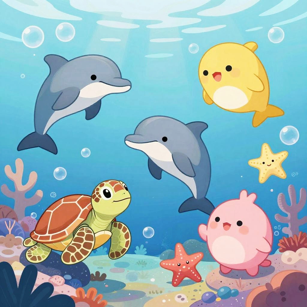 Kawaii style underwater world featuring smiling sea creatures like dolphins, turtles, and starfish, soft coral reefs and bubbles, light rays penetrating water surface, gentle pastel shades creating a peaceful and joyful scene