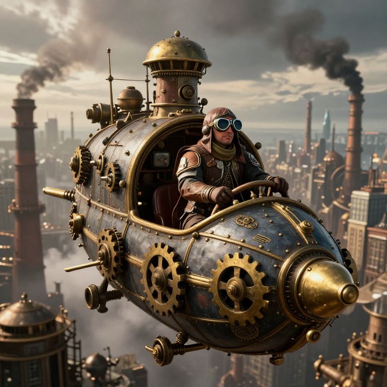 Genger, a steampunk inspired airship cruising above a sprawling industrial metropolis, with billowing smoke stacks and intricate machinery, the captain at the helm wearing vintage aviator goggles, detailed gears and brass elements, cinematic lighting and dramatic sky.