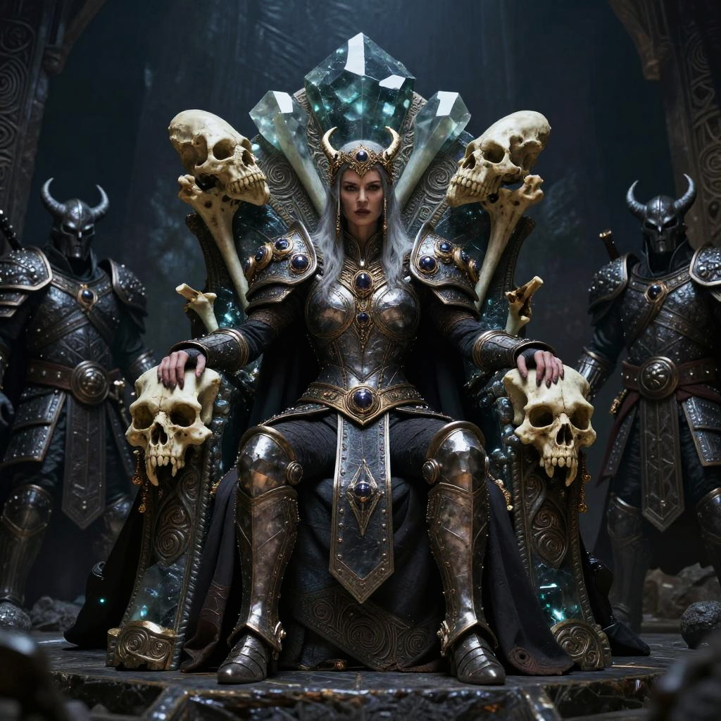 Digital artwork of a stern, armored woman with pale skin, dark hair, and red lipstick, seated on a throne adorned with large, glowing blue crystals and skulls. She wears intricately detailed, silver and black armor with ornate patterns. Four horned, dark-armored guards stand behind her. The background is dark and ominous, with swirling patterns. The woman's expression is intense, and she holds two skulls on the armrests of the throne. The overall atmosphere is dark and gothic, with a fantasy, medieval theme.