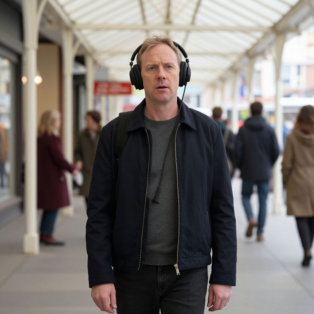 A man in a black jacket with headphones on, standing in a shopping pavilion with natural lighting, directed by Wes Anderson.