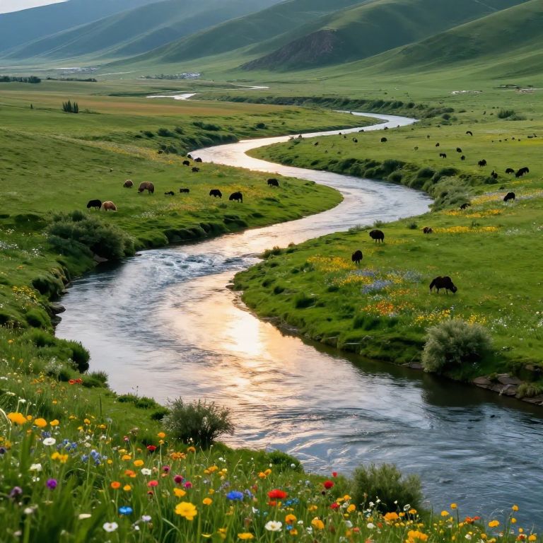 Photograph of a vibrant, sunlit meadow with a winding, reflective river cutting through the center. The river reflects the soft, golden light of the setting or rising sun. Green hills rise in the background, covered in lush grass. Scattered across the meadow are numerous grazing cows, adding a sense of life and movement. Bright wildflowers, including yellow, red, and white blossoms, dot the foreground, enhancing the scene's natural beauty. The sky is clear, and the overall atmosphere is serene and picturesque. The image captures the essence of a peaceful, rural landscape.