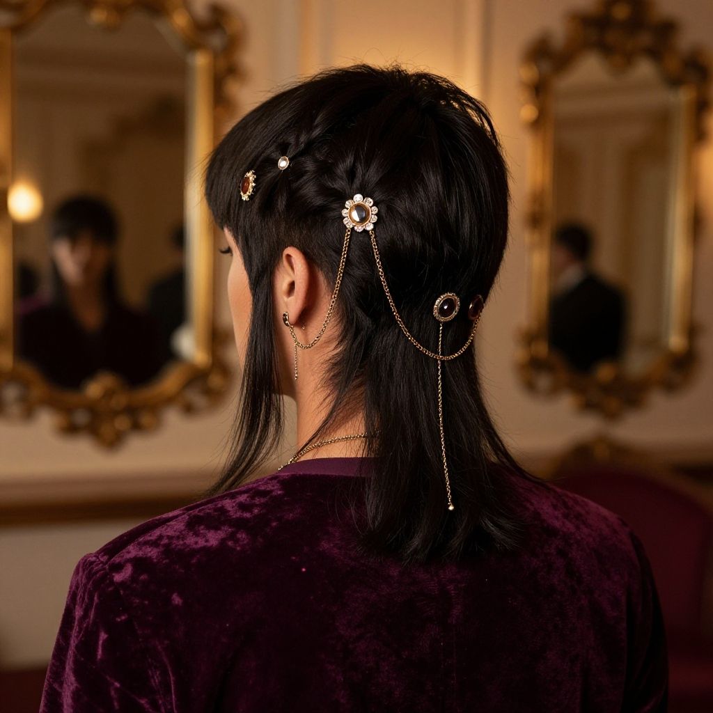 Fancy mullet haircut adorned with elegant accessories like jeweled pins and gold chains, worn by a confident individual in a lavish ballroom setting, soft ambient lighting, rich velvet fabrics, ornate mirrors reflecting the intricate hairstyle, cinematic atmosphere.
