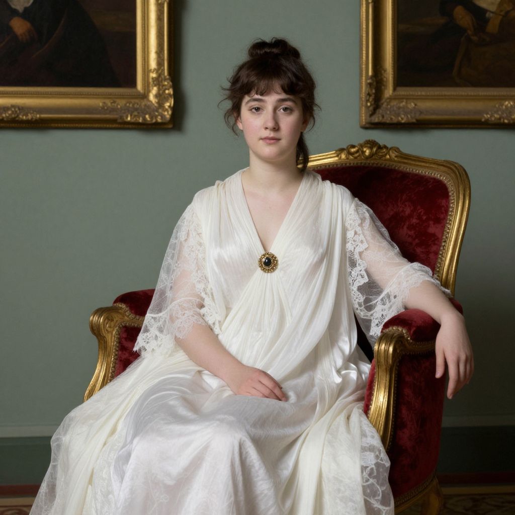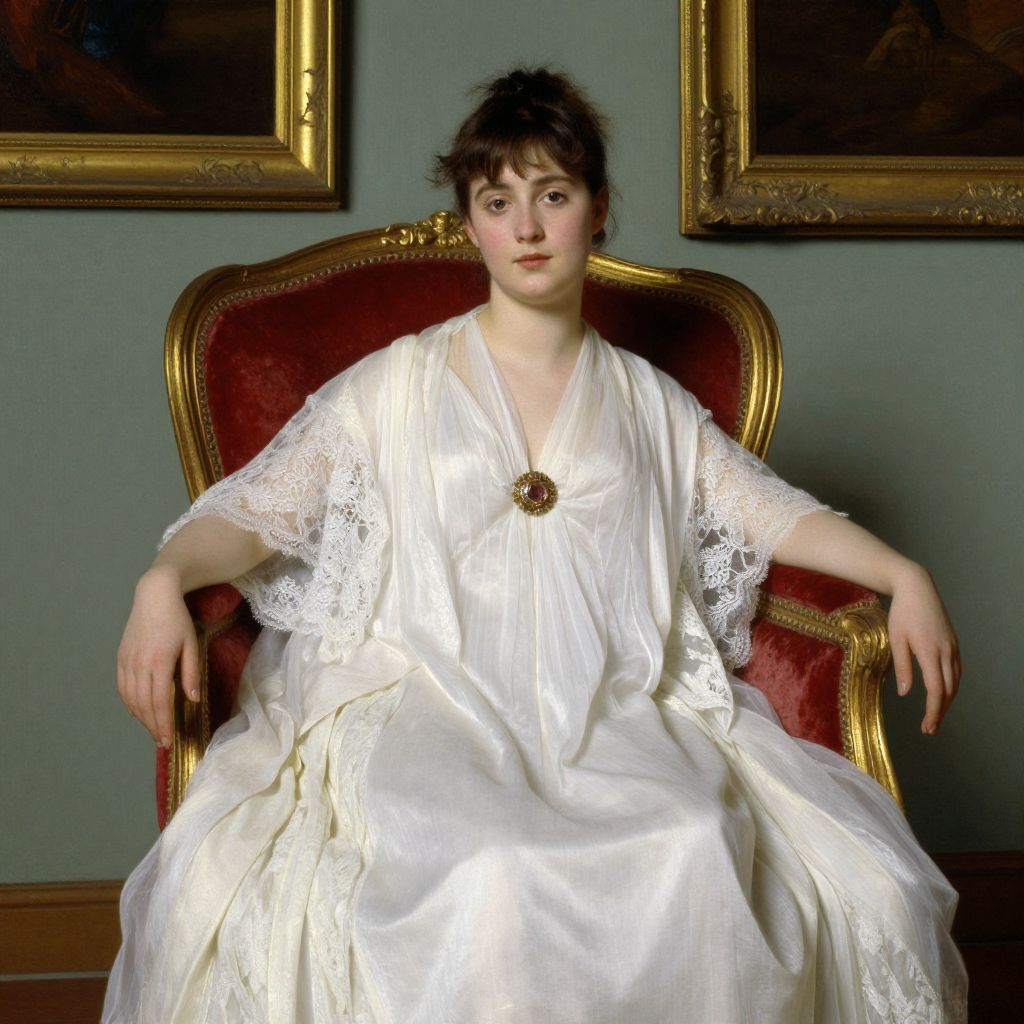 Photograph of a young Caucasian woman with pale skin and dark brown hair in an updo, seated in an ornate, red velvet armchair with gold trim. She wears a white, satin dress with lace sleeves and a V-neck, adorned with a gold brooch at the chest. The background features a muted green wall with two framed, classical paintings. The woman's expression is calm, and her posture is relaxed with one hand resting on the armchair's armrest. The lighting is soft, highlighting the texture of the lace and satin.