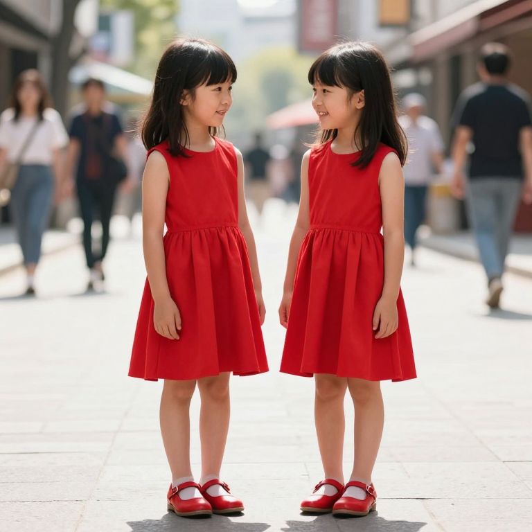 Two young girls stand side by side on a sunny street, both wearing vibrant red sleeveless dresses that reach mid-calf, complemented by matching red shoes, as they smile and engage in conversation amidst a bustling urban backdrop.
