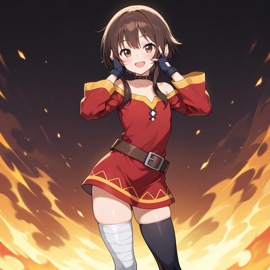 Kono subarashii sekai ni shukufuku wo!, 1girl, solo, standing, looking at viewer, (no headwear:1.1), brown hair, short hair with long locks, red eyes, blush, open mouth, smile, black choker, collarbone, flat chest, off-shoulder dress, dress, red dress, long sleeves, black gloves, fingerless gloves, belt, brown belt, gold trim, zettai ryouiki, skindentation, (asymmetrical legwear:1.4), mismatched legwear, (bandaged leg:1.3), black thighhighs, hands on own face