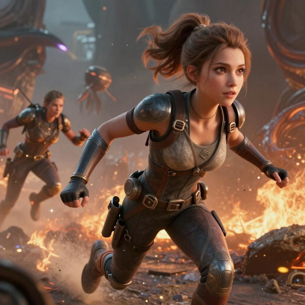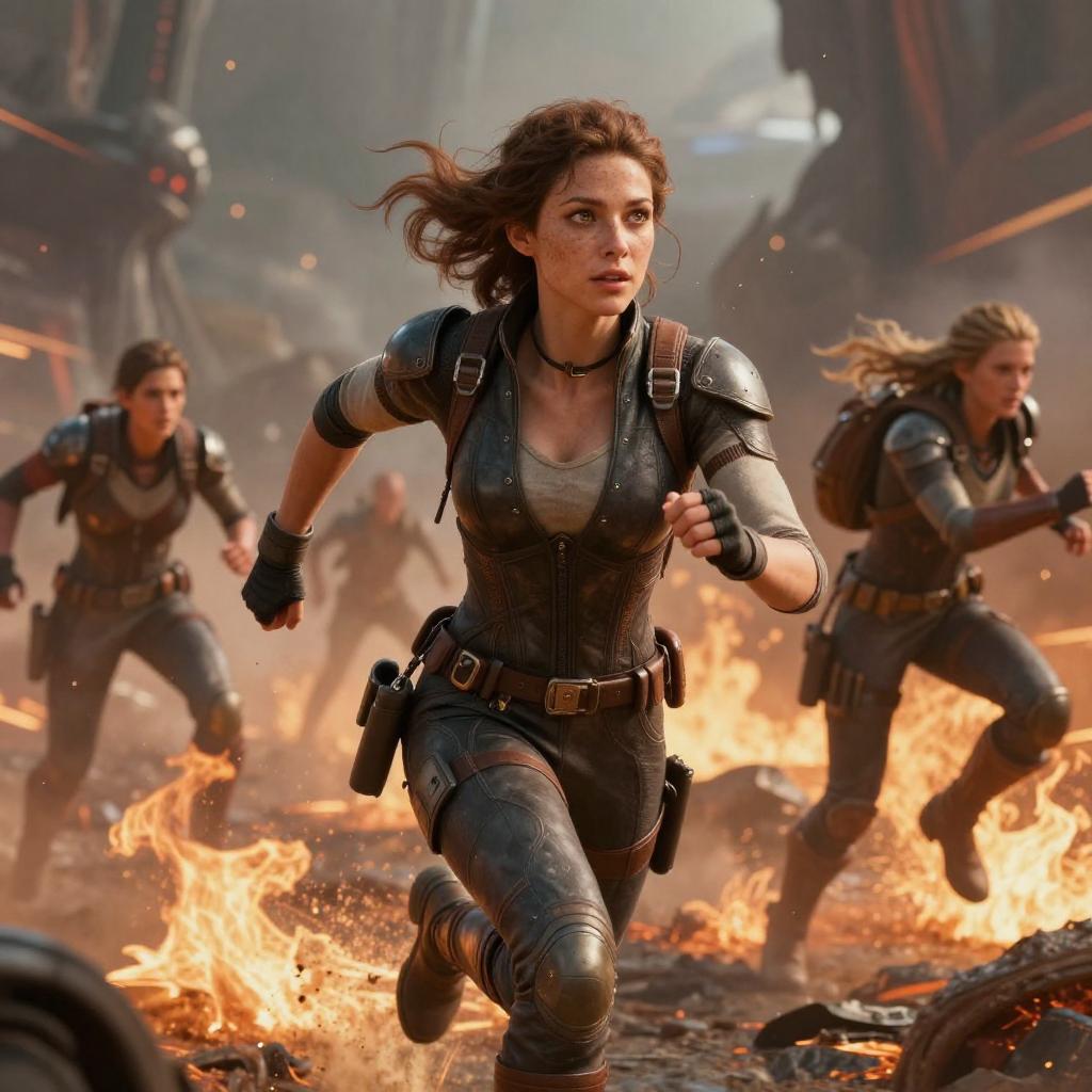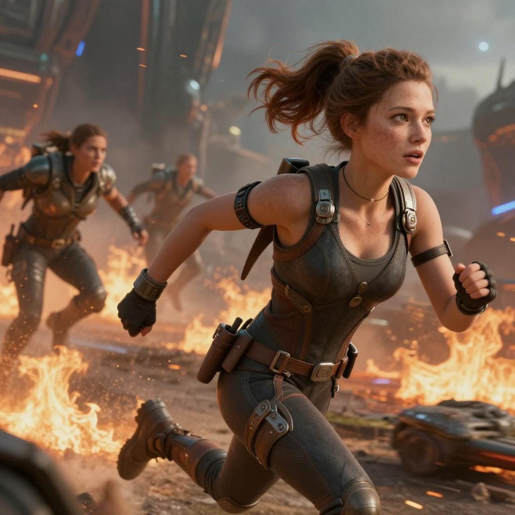 A woman running through fiery alien world, epic space battle, ((beautiful hazel eyes)), (femshep face), freckles, action sequence, canon 5d, sharp focus, highly detailed, digital photograph, cinematic lighting, hyper realism, intricate, lifelike, photorealistic, instagram, photography by vanessa joy and vivian maier