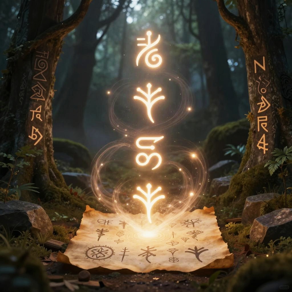 Runas ancient mystical symbols glowing softly on old parchment, surrounded by swirling ethereal lights and floating magical glyphs, in a dark enchanted forest with mist and mysterious runes carved into stone pillars, fantasy style.