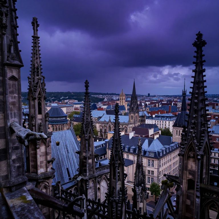 This photograph captures a dramatic, high-angle view of a Gothic cityscape under a dark, stormy sky. Foreground features detailed, towering Gothic spires and ornate stone architecture. Midground reveals a mix of historic buildings with blue-tiled roofs and a prominent church steeple. Background shows a sprawling urban landscape with a blend of old and modern architecture. The overall color palette is dominated by dark blues and grays, contrasting with the illuminated building roofs. The image's texture is sharp, emphasizing the intricate stone carvings and the stormy, moody atmosphere.