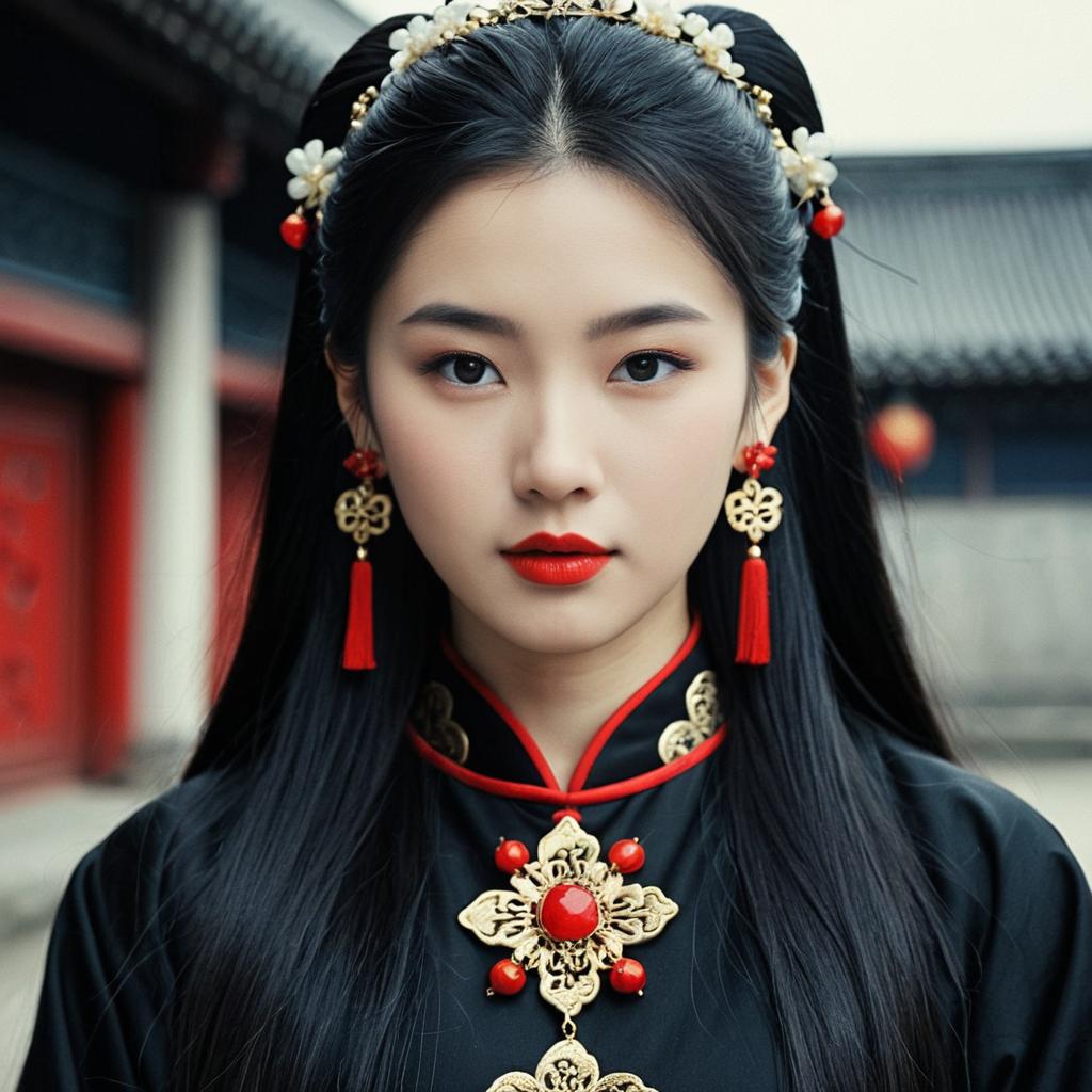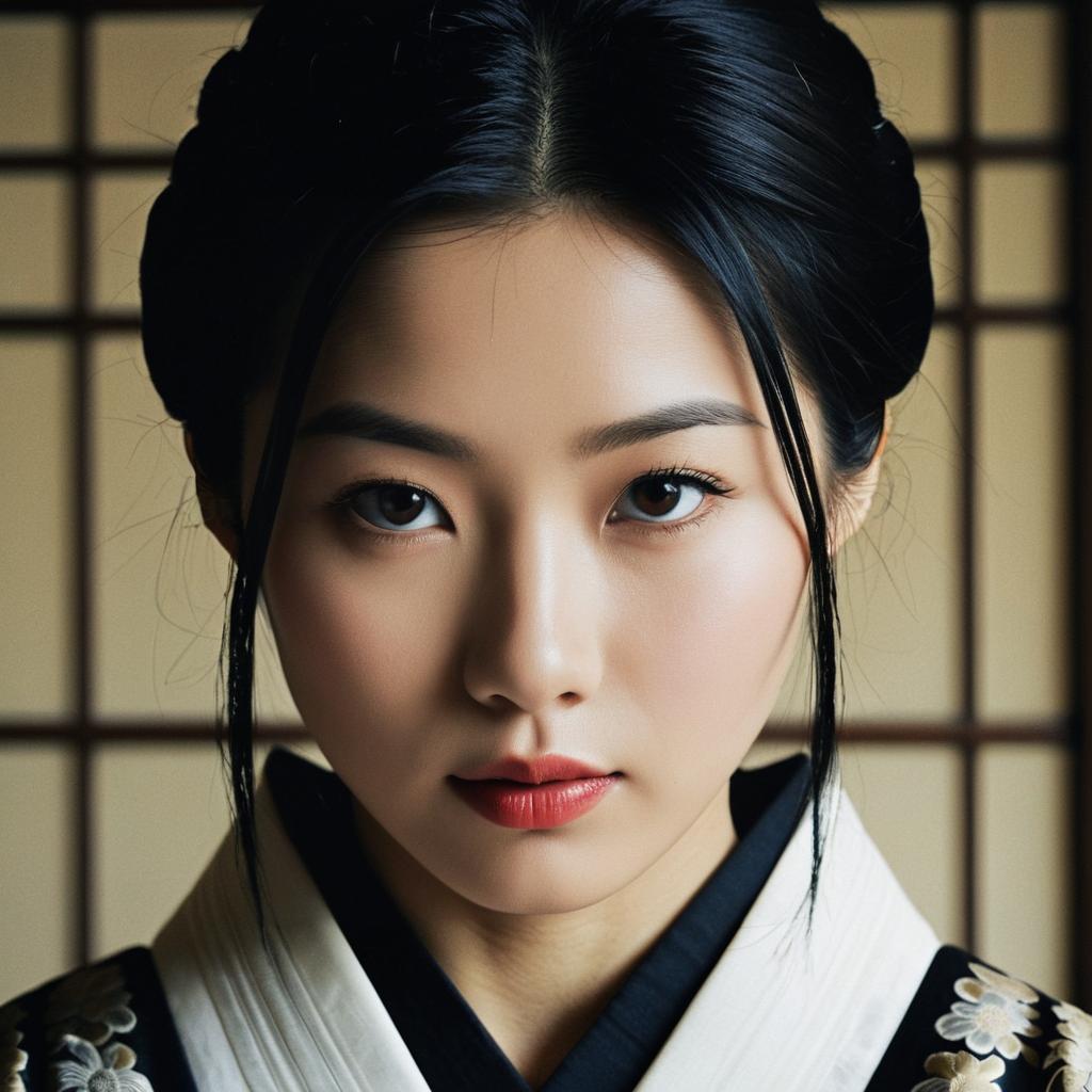 A front face photo of a regal Japanese woman with a traditional image of beauty. Known for their silky jet black hair, gentle gaze, and ancient culture.