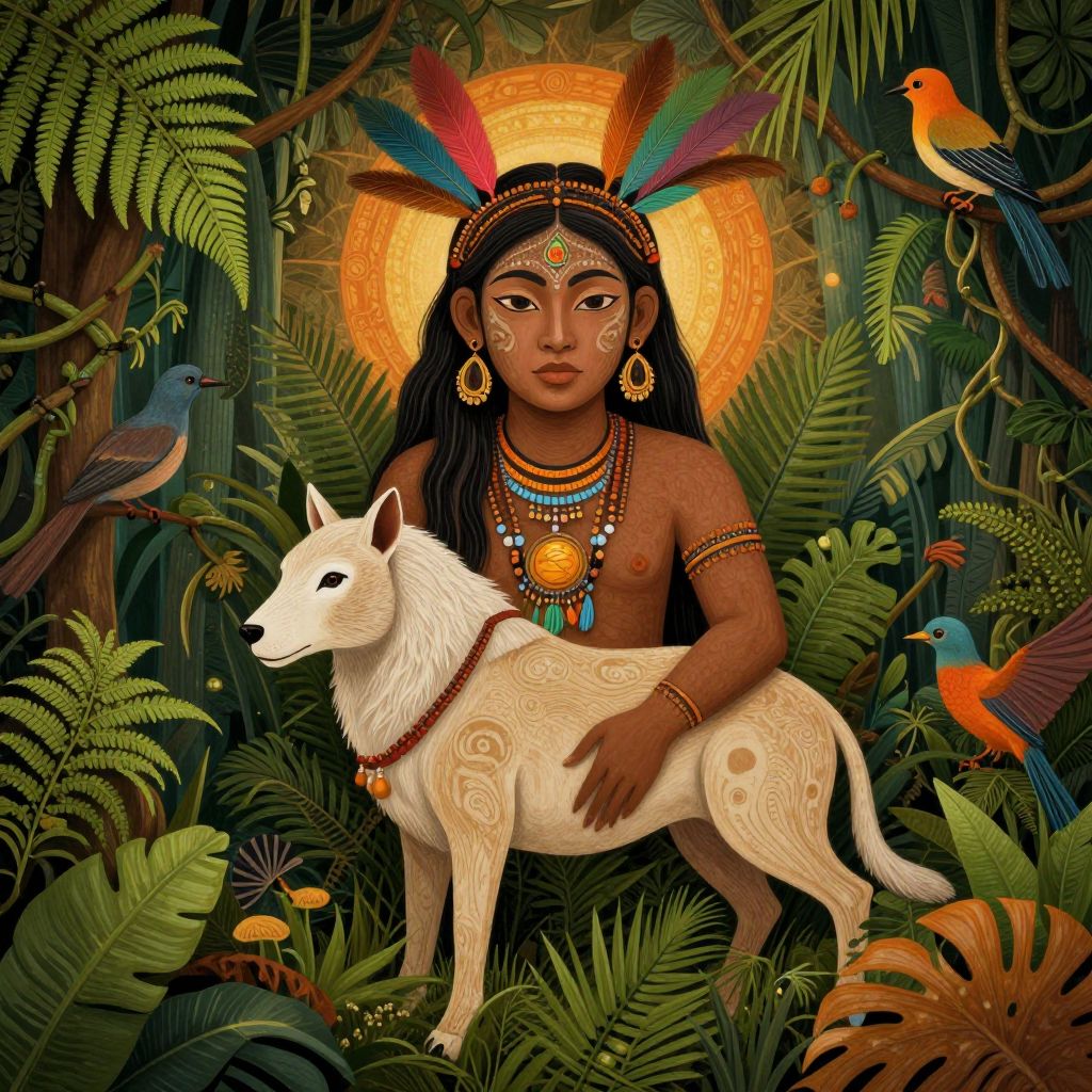 Portrait of Kaax spirit in tribal art style, combining human and animal features, surrounded by jungle motifs like ferns, tropical birds, and vines, vibrant earthy tones with hints of bright feathers, spiritual energy emanating, detailed and expressive illustration