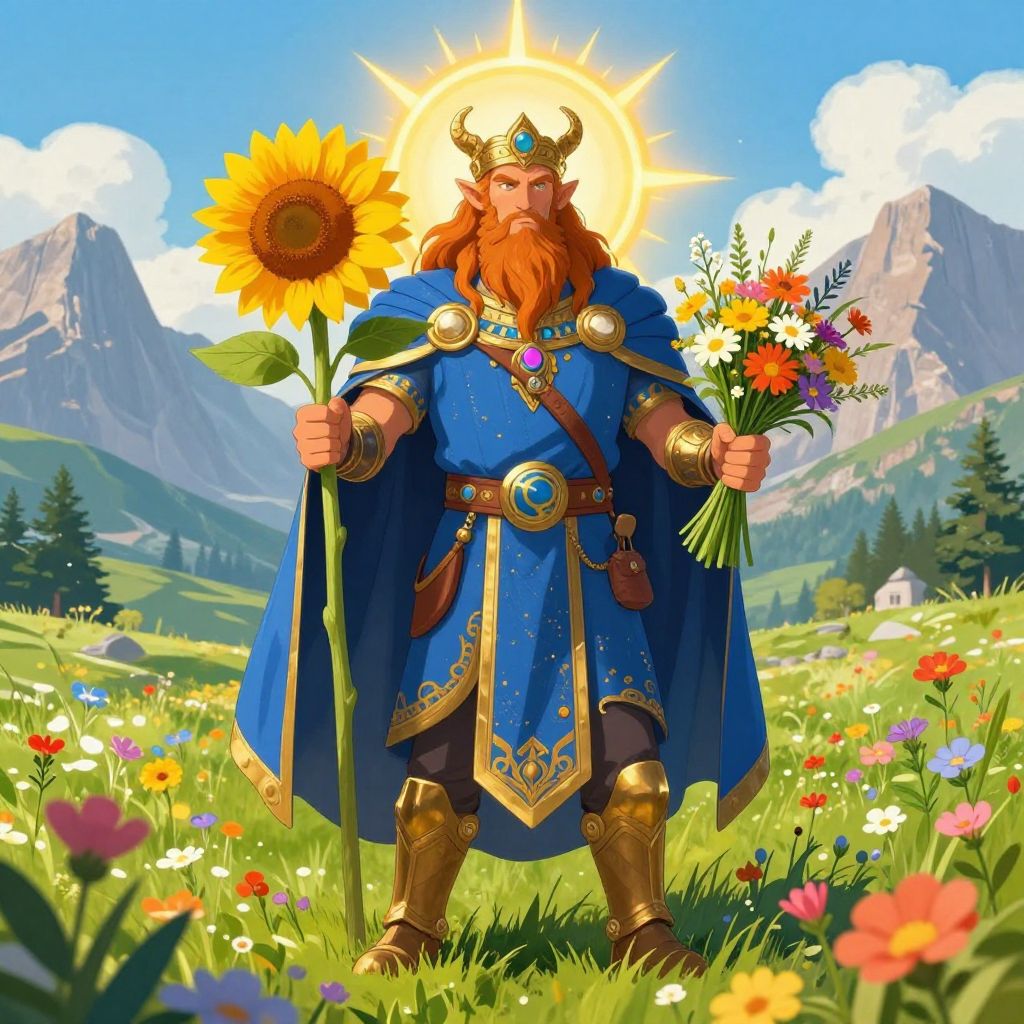 A majestic figure representing Baldur, the god of light and purity, stands in a vast golden wheat field under a bright blue sky with soft clouds and distant mountain peaks. The figure is glowing with an ethereal aura, featuring bright blue skin, shining golden armor, and luminous, feather-like light radiating from the head. The scene conveys warmth, kindness, and divine presence with swirling aurora-like light effects in the background.