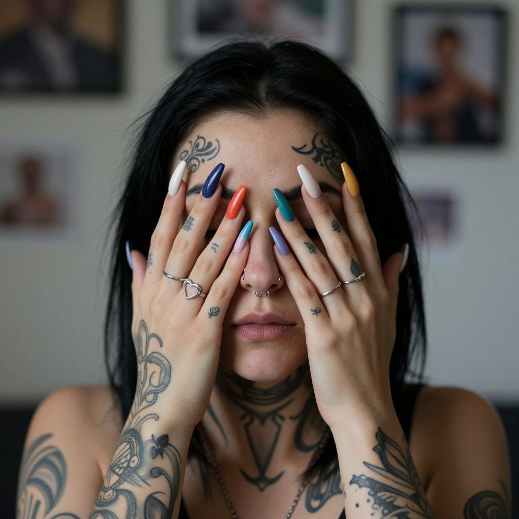 Photograph of a tattooed woman with dark hair covering her eyes with her hands, showcasing long, multicolored nails and intricate black tattoos on her forehead, cheeks, and neck. She's wearing a silver heart ring and a nose stud, with a blurred indoor background featuring framed pictures and soft lighting. Her expression looks pensive and introspective.