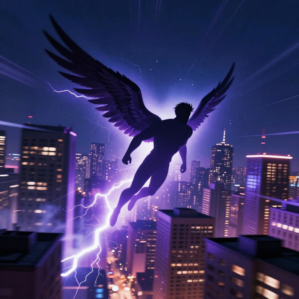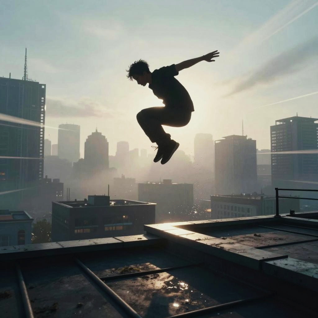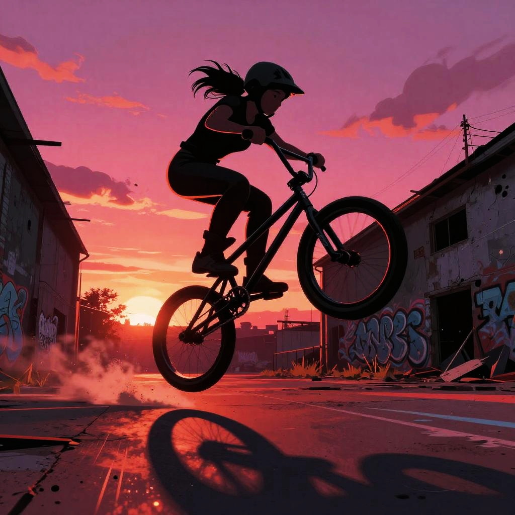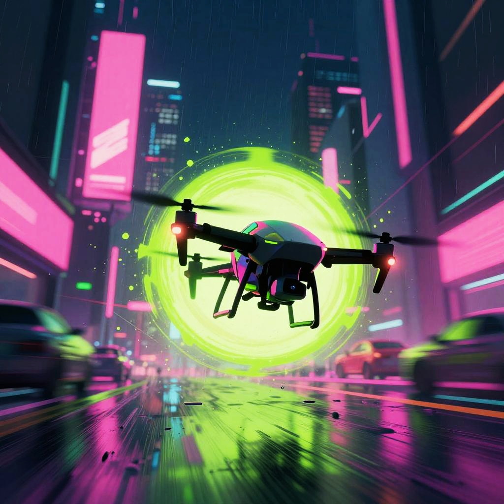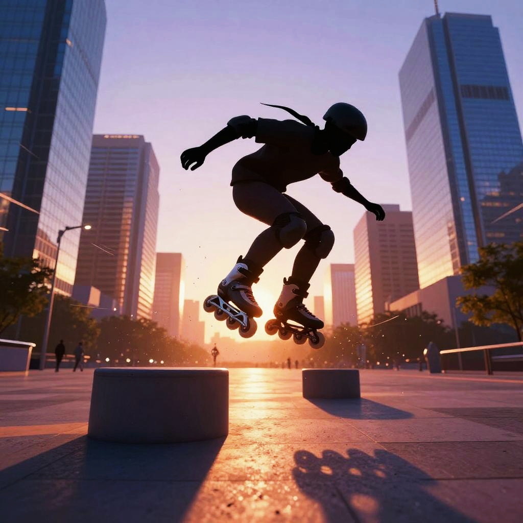 A dynamic, highly stylized digital illustration of a skateboarder performing a high ollie moving through graffiti-covered urban skate park at twilight, bathed in neon green, purple, and electric blue lights. Crisp silhouette against sweeping motion blur and radiant haze; rim light, speed lines, flying particles, reflective surfaces, soft bloom, bold contrast, cinematic depth, energetic poster drama, subtle film grain, razor-sharp edges.