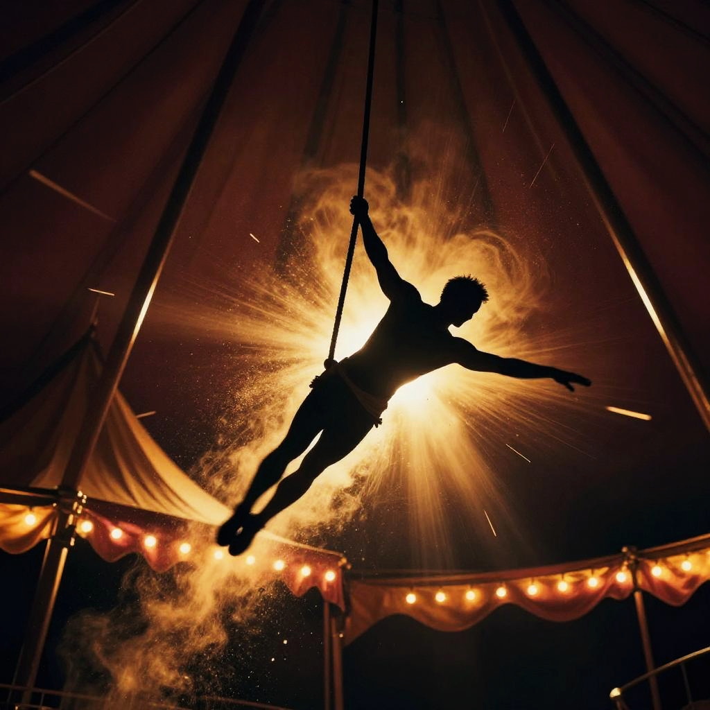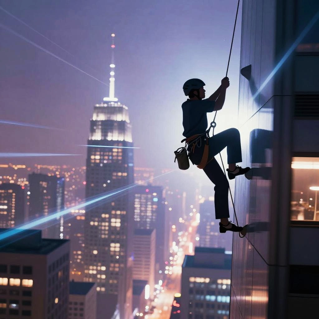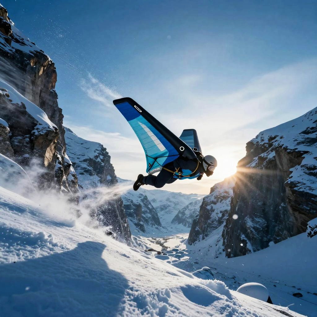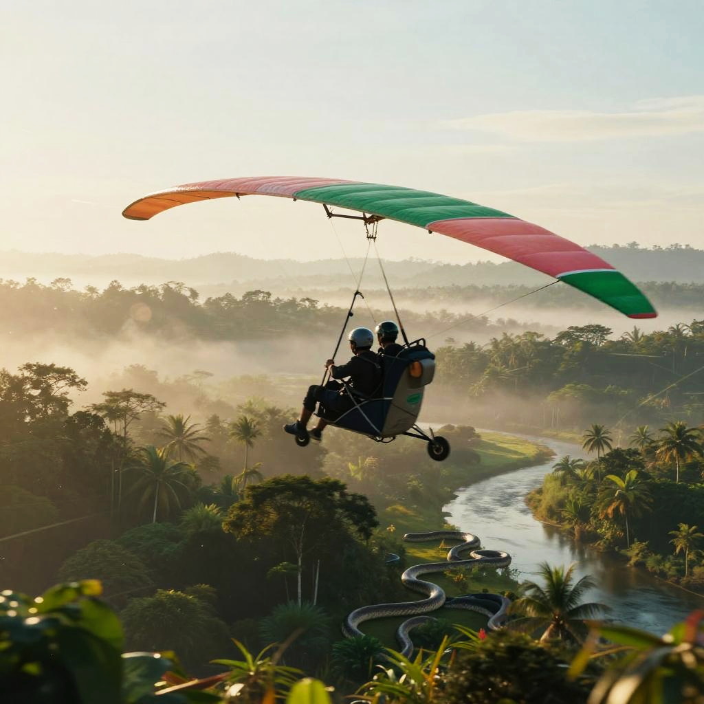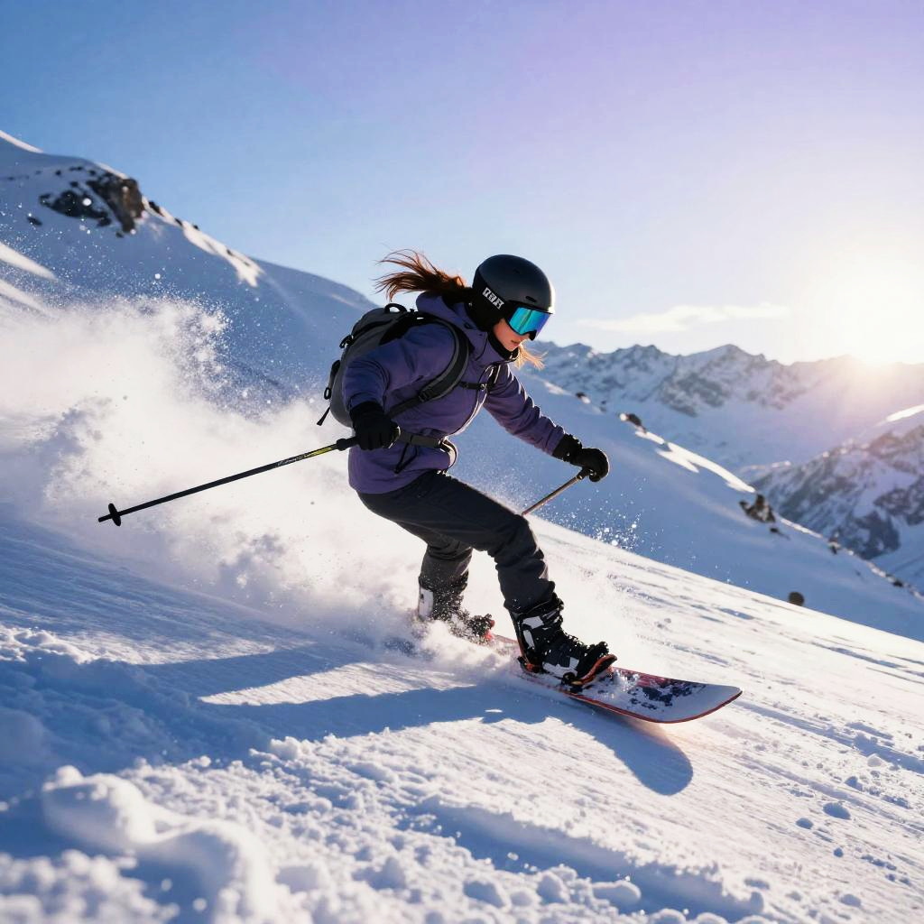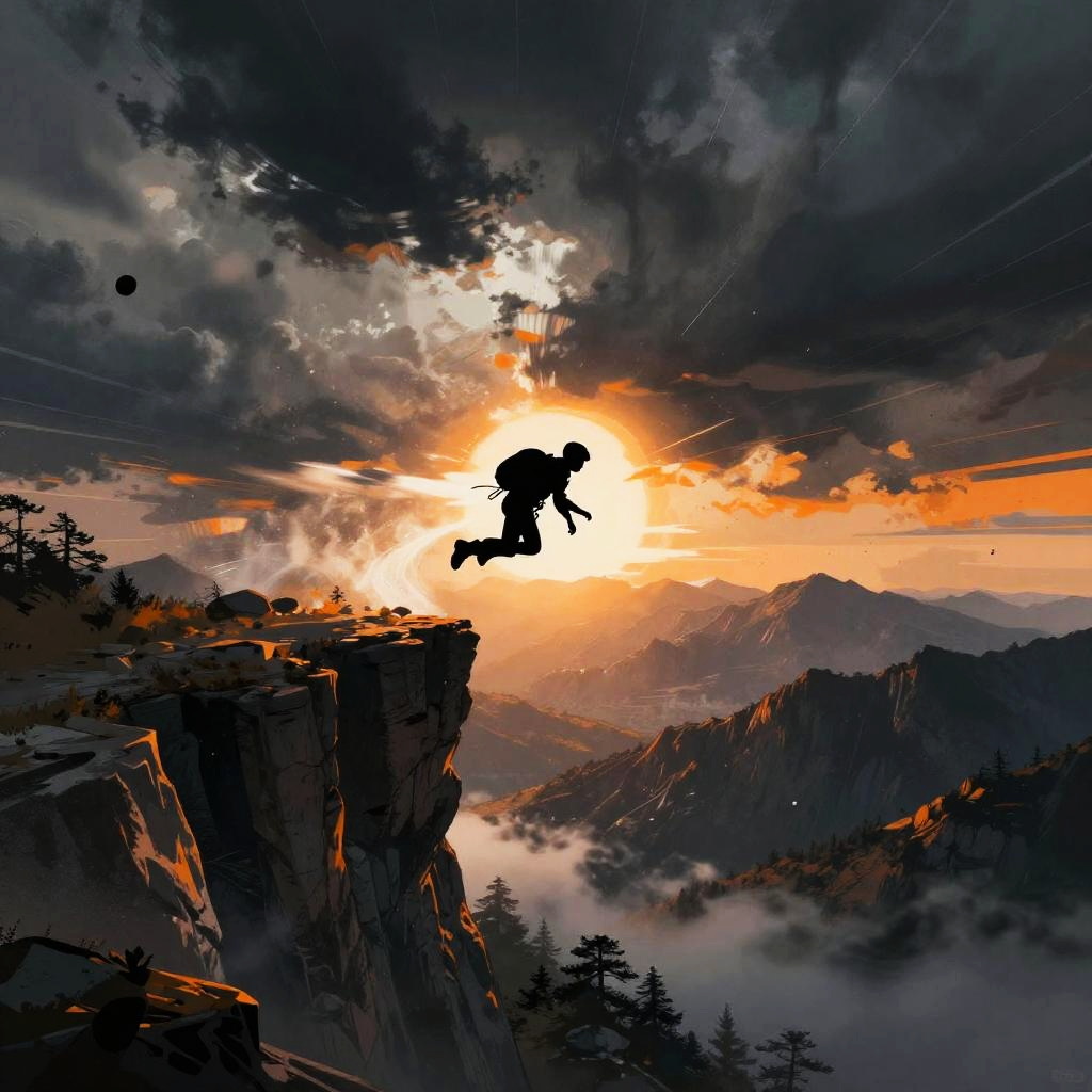 A dynamic, highly stylized digital illustration of a skateboarder performing a high ollie moving through graffiti-covered urban skate park at twilight, bathed in neon green, purple, and electric blue lights. Crisp silhouette against sweeping motion blur and radiant haze; rim light, speed lines, flying particles, reflective surfaces, soft bloom, bold contrast, cinematic depth, energetic poster drama, subtle film grain, razor-sharp edges.