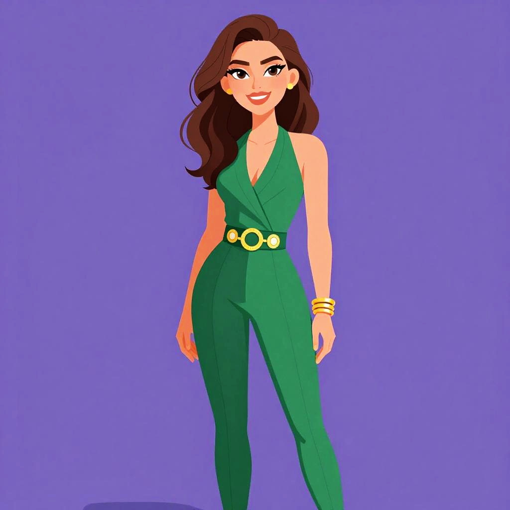 Digital illustration of a woman with brown hair, wearing a green blazer and pants, black sunglasses, and brown ankle boots, standing against a solid purple