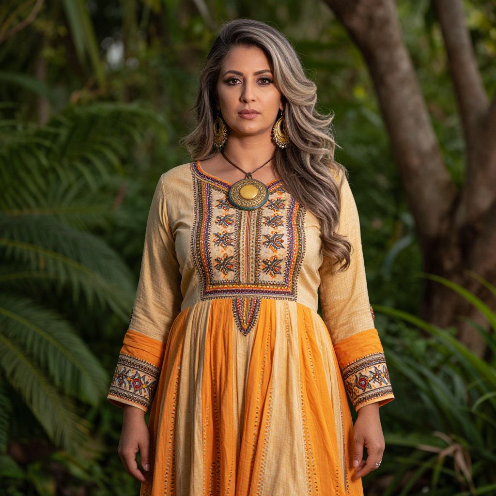 Photograph of a South Asian woman standing in a lush, green forest. She has long, wavy, silver-highlighted brown hair and wears a yellow traditional kameez adorned with intricate gold and red embroidery on the chest and sleeves. A large, circular gold pendant hangs from a black cord around her neck. Her expression is calm and confident. The background features dense foliage with large green leaves and tree trunks. She also wears large, gold, teardrop earrings. The image has a warm, natural light, highlighting her attire and the greenery around her.