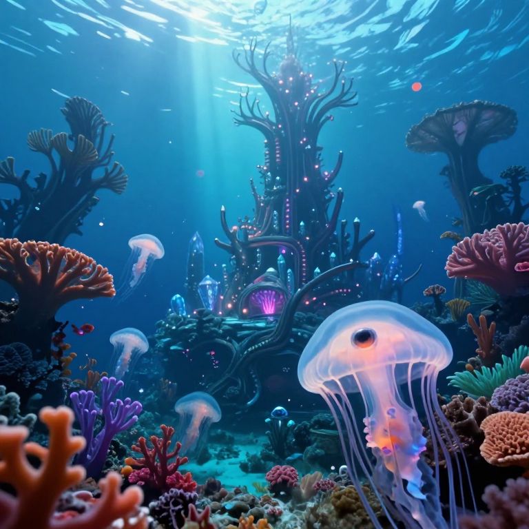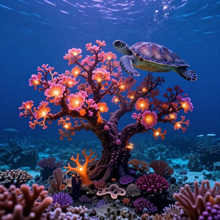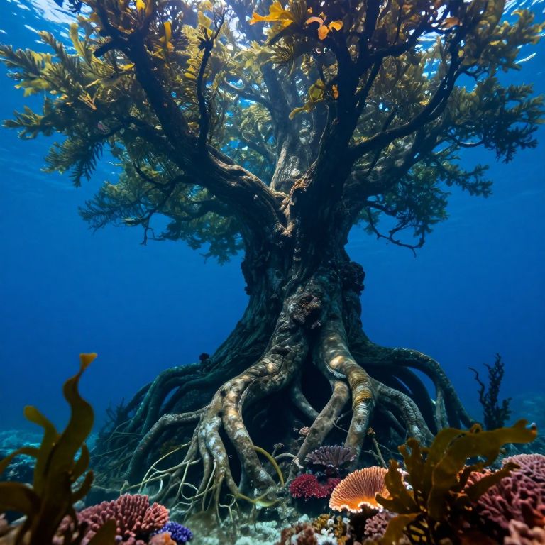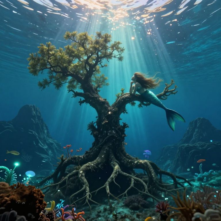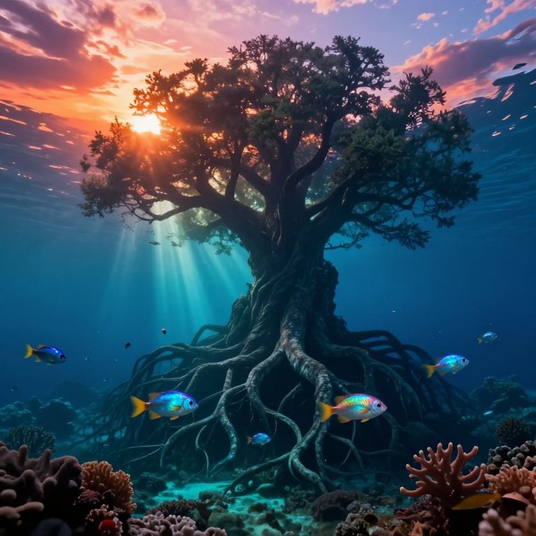 Envision an otherworldly seascape where an ancient tree, colossal in stature, rises from the depths of the ocean, its roots weaving intricate coral patterns beneath the surface. The scene is bathed in dual sunsets, one blazing with vibrant colors over the horizon and another ethereal glow emanating from below the waves, casting a mysterious light on the submerged forest. Schools of iridescent fish dart around the tree's gnarled branches, their scales shimmering like precious gems against the aqueous backdrop, creating a dreamlike tableau that oscillates between serene tranquility and enigmatic allure. This imagined landscape fuses the fantastical elements of an adventure story with the ethereal beauty of impressionist seascape, inviting viewers into an enchanting world where reality and fantasy harmoniously coalesce to reveal the untold stories hidden beneath the surface.