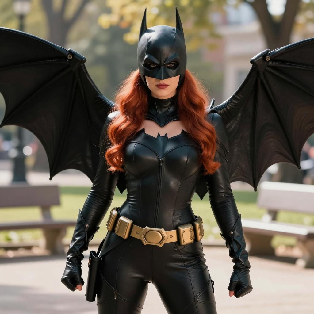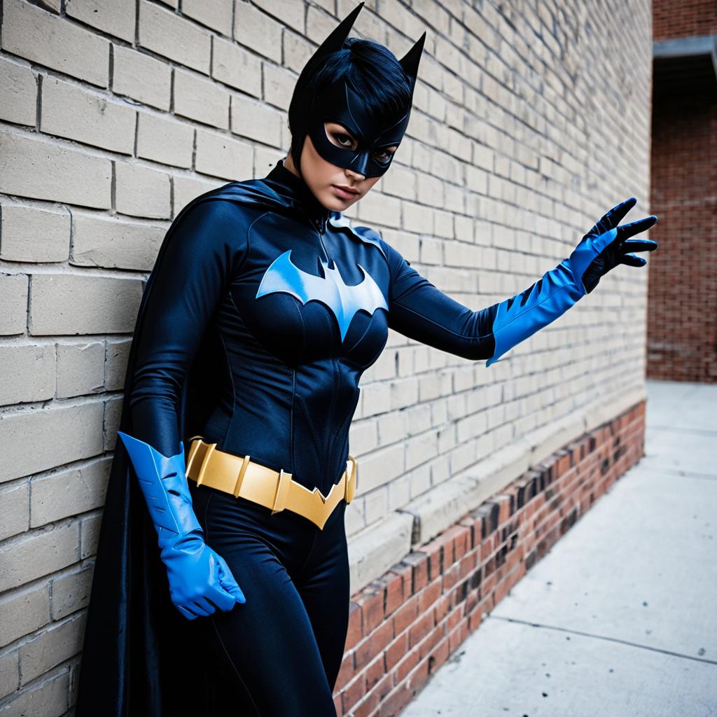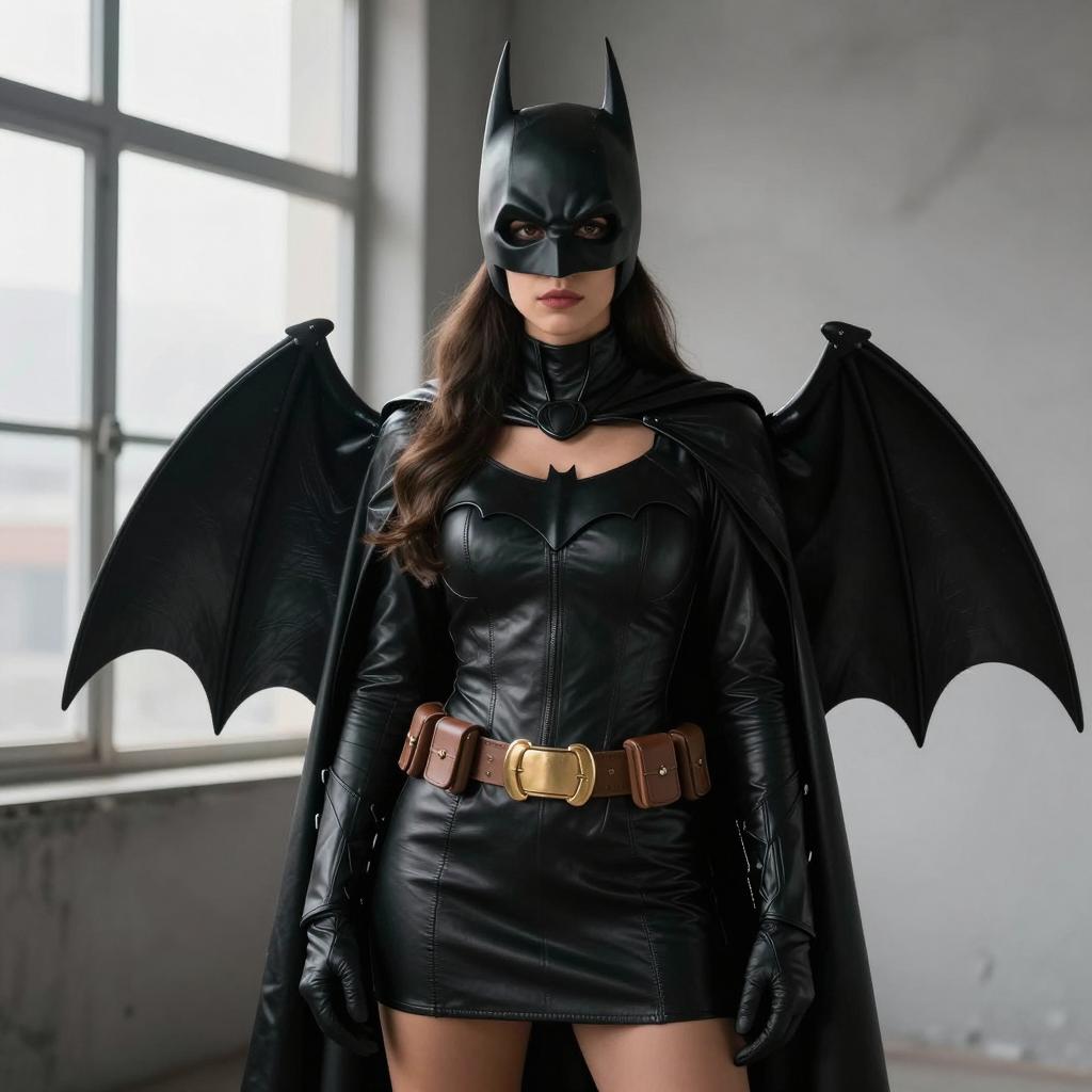 Woman batgirl wing dress, photograph, woman, batman cosplay, black leather suit, bat ears, mask, bat wings cape, brown belt with gold buckle, standing, daytime, indoor, soft natural light, gray wall, window in background, long brown hair, serious expression, realistic, high detail, front view, full body