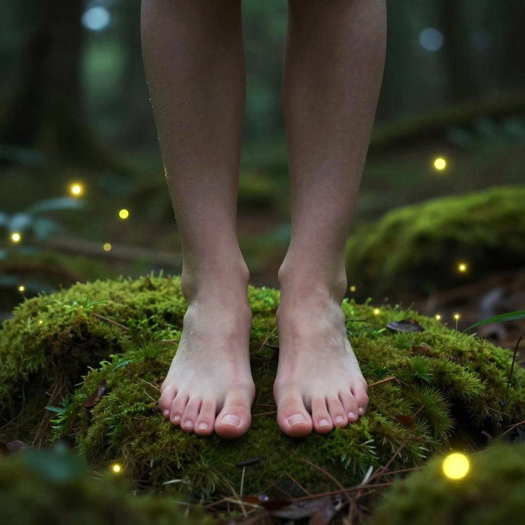 A photograph of a pair of bare feet standing on lush, green moss in a dark forest. The feet are pale with neatly trimmed toenails. Tiny, glowing yellow fireflies are scattered around, adding a magical ambiance. The background is blurred, featuring dark tree trunks and dim forest light. The texture of the moss is soft and dense, contrasting with the smooth skin of the feet. The image has a dreamy, enchanted forest feel.