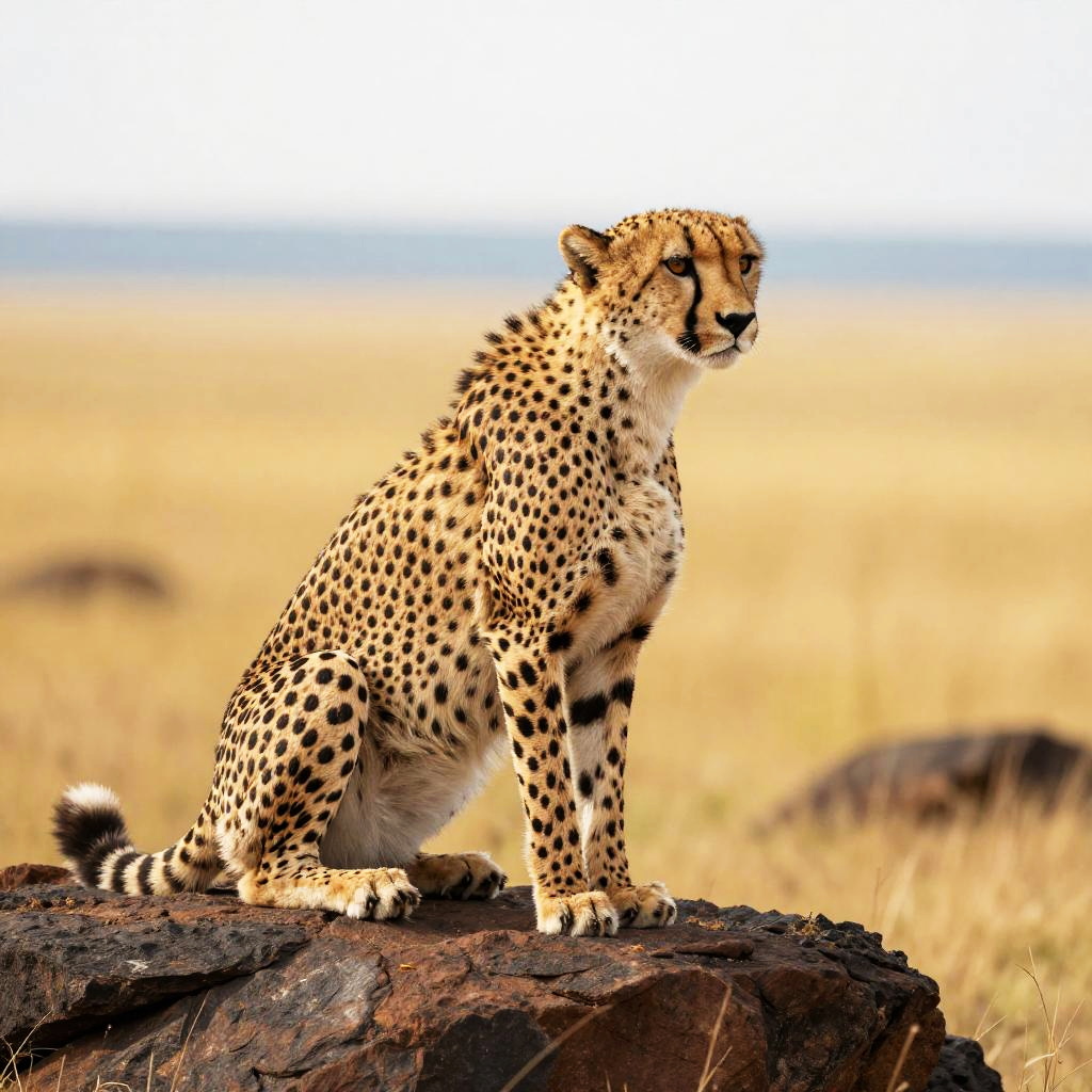 Photograph of three cheetahs sitting in golden grassland, with sunlight casting a warm glow, highlighting their spotted fur and alert expressions.