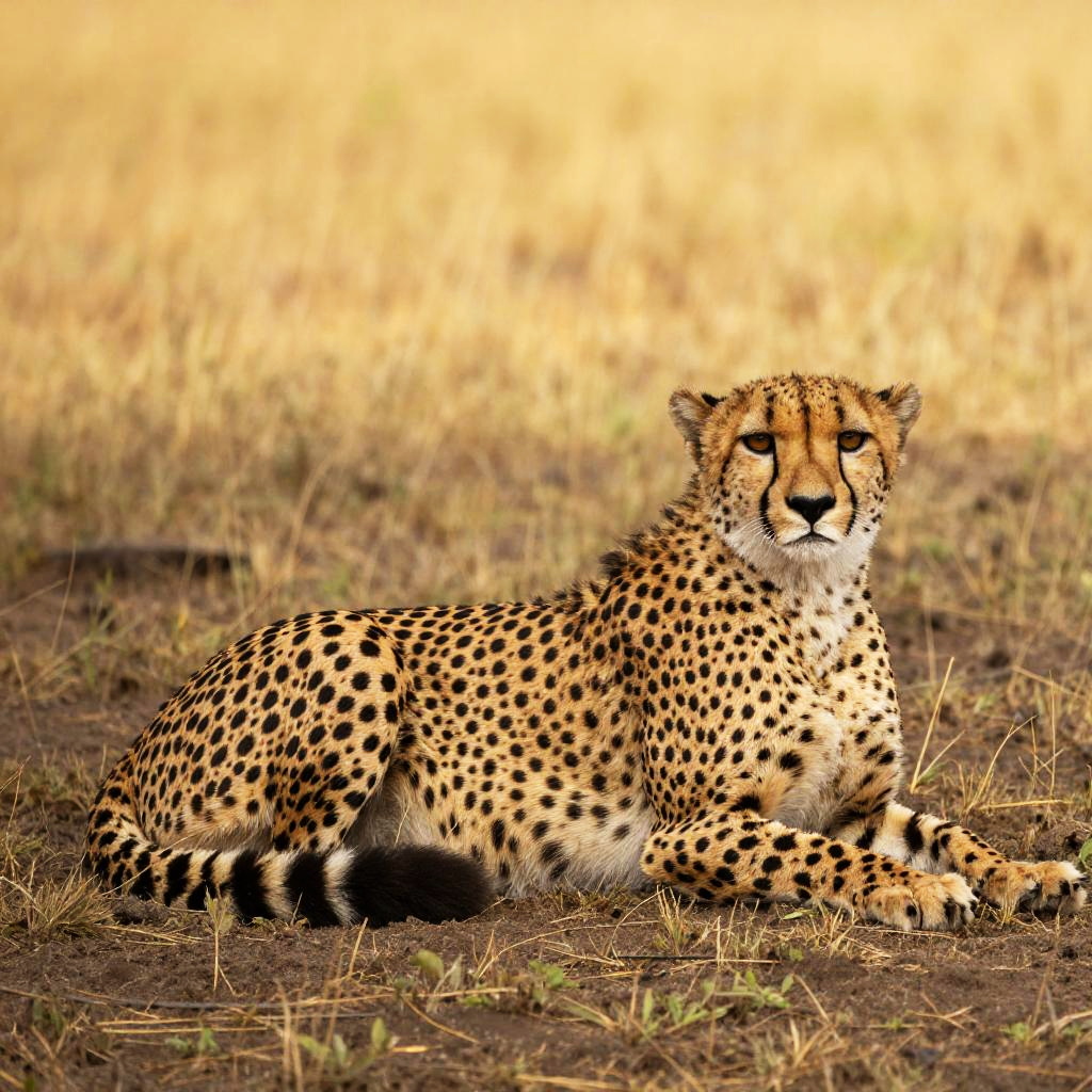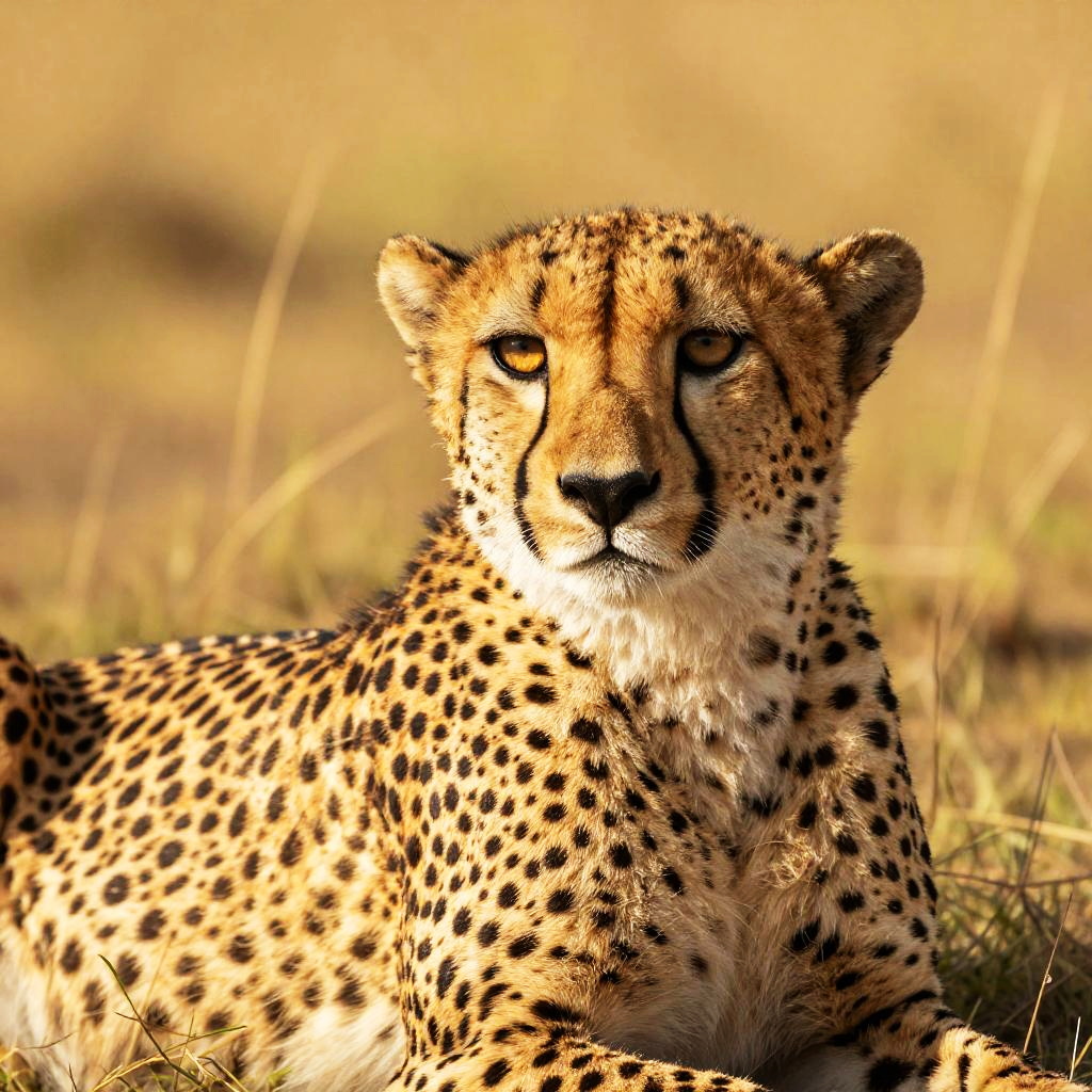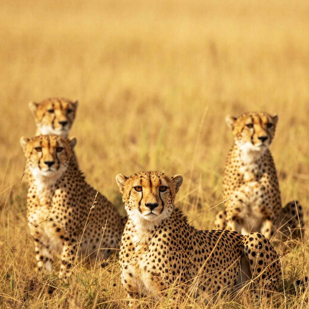 Photograph of three cheetahs sitting in a golden, sunlit savanna. The cheetah in the foreground is centered, gazing directly at the camera with a focused expression. The other two cheetahs are slightly blurred in the background, positioned to the left and right. All three cheetahs have golden-yellow coats with distinctive black spots. The dry grass in the savanna is tall and golden, adding a warm, textured backdrop to the image. The sunlight casts a soft, golden glow over the scene, highlighting the cheetahs' sleek, athletic bodies.