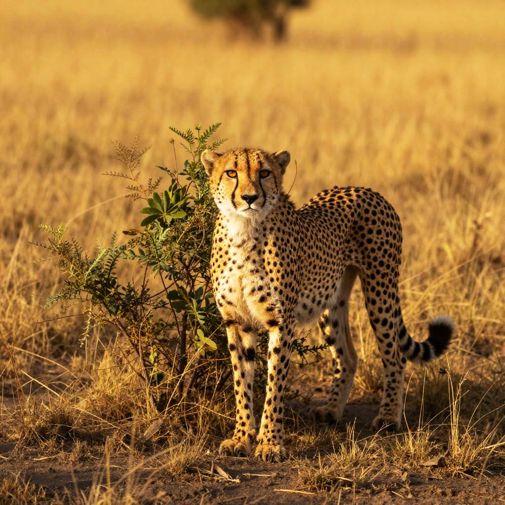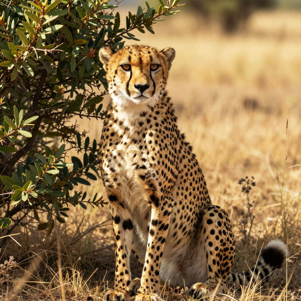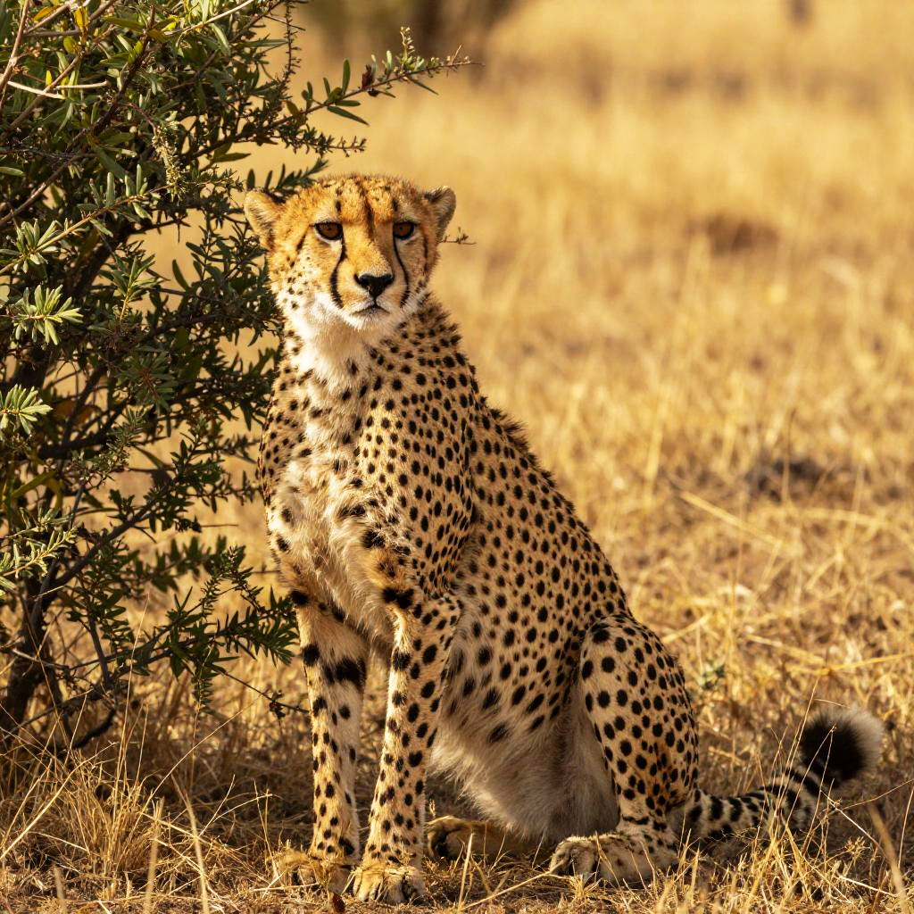 Photograph of three cheetahs sitting in a golden, sunlit savanna. The cheetah in the foreground is centered, gazing directly at the camera with a focused expression. The other two cheetahs are slightly blurred in the background, positioned to the left and right. All three cheetahs have golden-yellow coats with distinctive black spots. The dry grass in the savanna is tall and golden, adding a warm, textured backdrop to the image. The sunlight casts a soft, golden glow over the scene, highlighting the cheetahs' sleek, athletic bodies.
