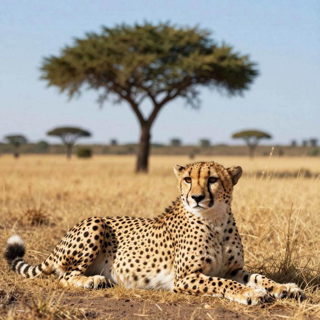Photograph of a sunny savanna with three cheetahs lying in the tall, golden grass. The cheetah in the foreground is closest to the camera, partially obscured by the grass, while the other two cheetahs are slightly blurred in the background. The warm, golden hues dominate the image, giving it a vibrant and natural feel. The cheetahs' spotted fur contrasts sharply against the bright grass.