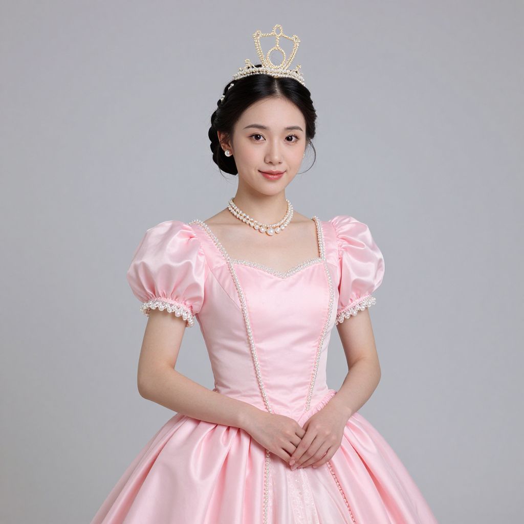 Pink Queen Costume, woman in pink dress with a crown and pearls