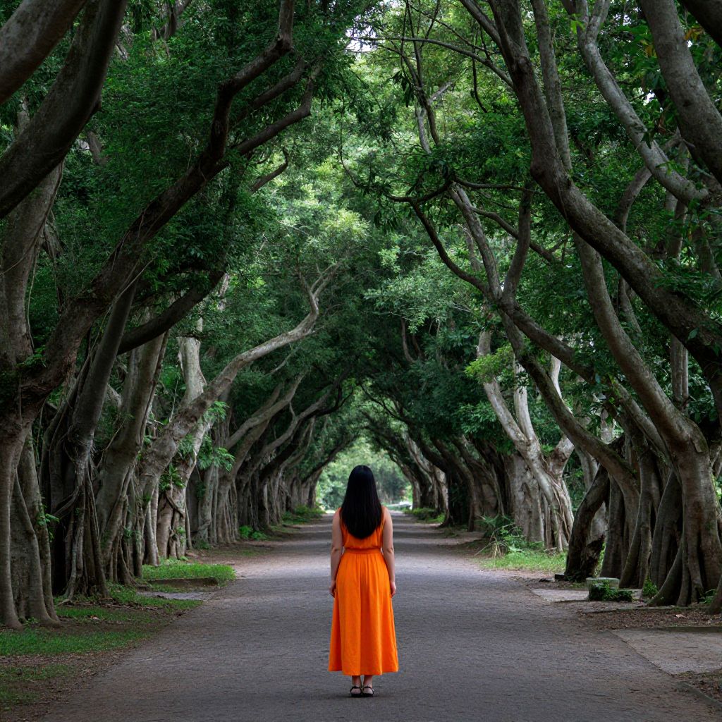 Photograph of a woman with long black hair in a bright orange dress standing in the center of a tree-lined, arching pathway.