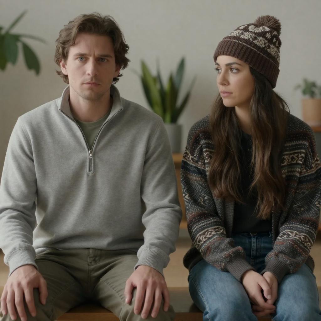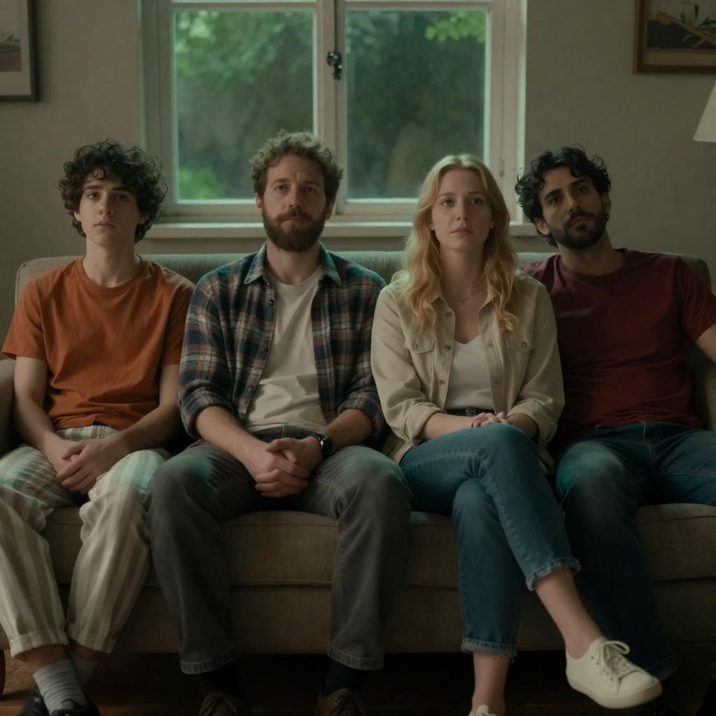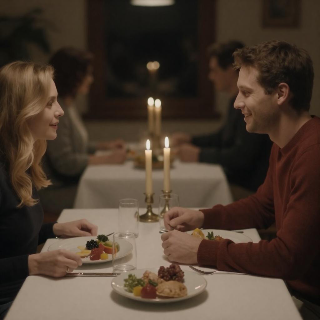 Photograph of four people at a kitchen table. Two men in casual shirts sit on the left and right, facing each other. A woman with blonde hair and a child sit on the right. Three candles on the table, glasses, and a bottle. Child in woman's arms. Warm, dim lighting. Background includes kitchen cabinets and windows. Men have short hair, focused expressions. Woman looks at child, child rests head on her shoulder. Casual, intimate setting.