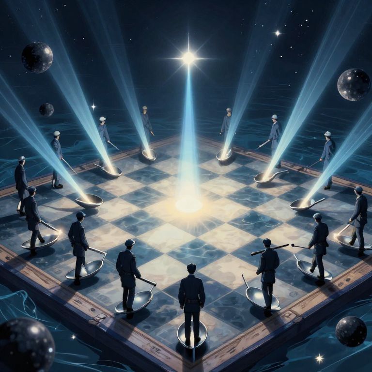 A digital illustration depicts a surreal, futuristic chess scene. Silhouetted players, dressed in dark suits, stand on a glowing checkered board illuminated by intense blue and white beams of light from above. Each player holds a hockey stick, poised as if ready to play. The background is a starry, cosmic space with floating silver spheres. The board is bordered by a metallic frame, and the light creates a radiant, almost heavenly effect at the center. The overall mood is otherworldly and dynamic, blending elements of chess strategy with sci-fi aesthetics.