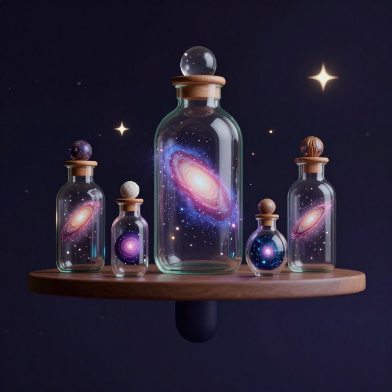 The image presents a surreal and highly detailed scene where a large, transparent jar filled with various small jars and containers is positioned between two open doors. The jar, which appears to be floating in mid-air, is filled with an array of colorful and textured objects, including jars of different sizes and shapes, some containing what looks like grains or seeds. The jars inside the main jar are arranged in a seemingly random yet harmonious manner, creating a sense of depth and complexity. The doors, one wooden and one dark blue, are open wide, framing the jar and allowing a view into the starry, cosmic background that surrounds the jar. The lighting is cinematic, with a warm, golden glow emanating from the jar, casting a soft light on the wooden floor and the surrounding space. The overall composition is balanced, with the jar centrally positioned between the doors, creating a focal point that draws the viewer's eye into the scene. The interplay of colors, textures, and shapes within the jar and the surrounding environment creates a sense of wonder and curiosity, inviting the viewer to explore the mysterious contents within.
