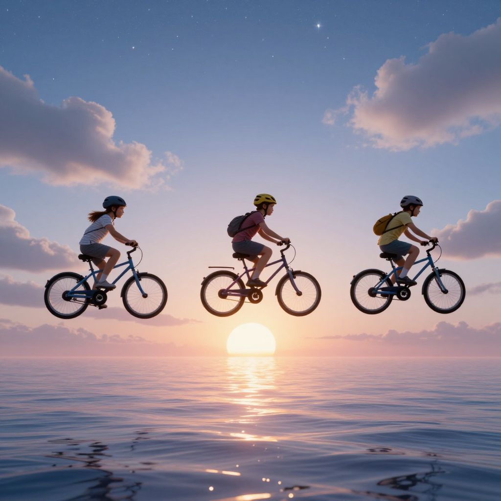 Three children pedal reversed bicycles through the ethereal sky, defying gravity as they journey toward a horizon where the sun dissolves into a shimmering sea of stars and clouds.