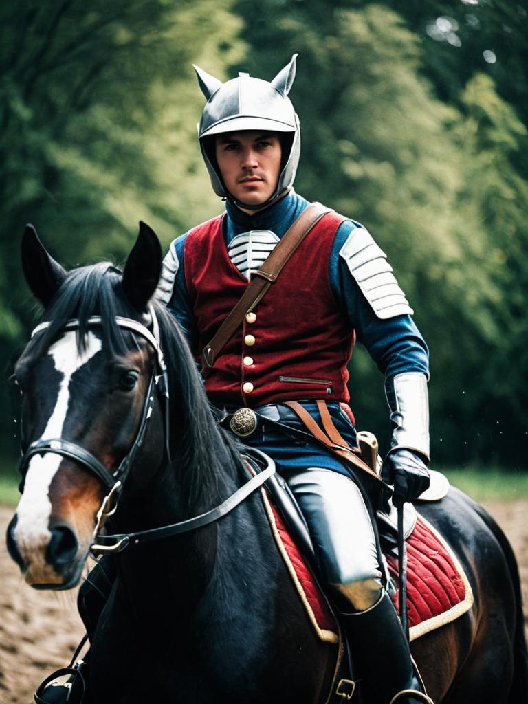 Man in Horse Rider costume, photorealistic cosplay portrait, cinematic realism