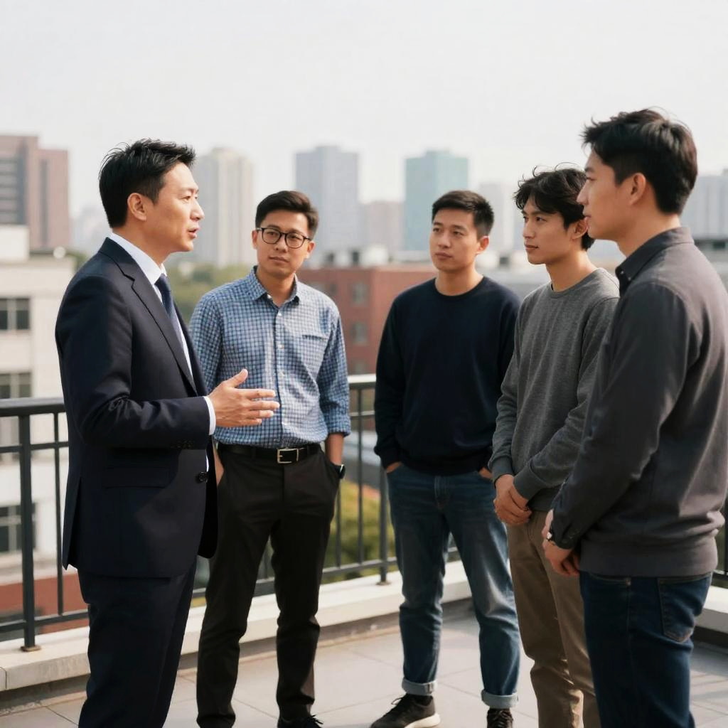 Photograph of two men walking through a brightly lit, arched tunnel with circular lights. The man on the left wears a black suit and tie, while the man on the right wears a light blue suit. Both have short hair and are walking side by side on a stone pathway. The tunnel has beige stone walls with green plants at the base.