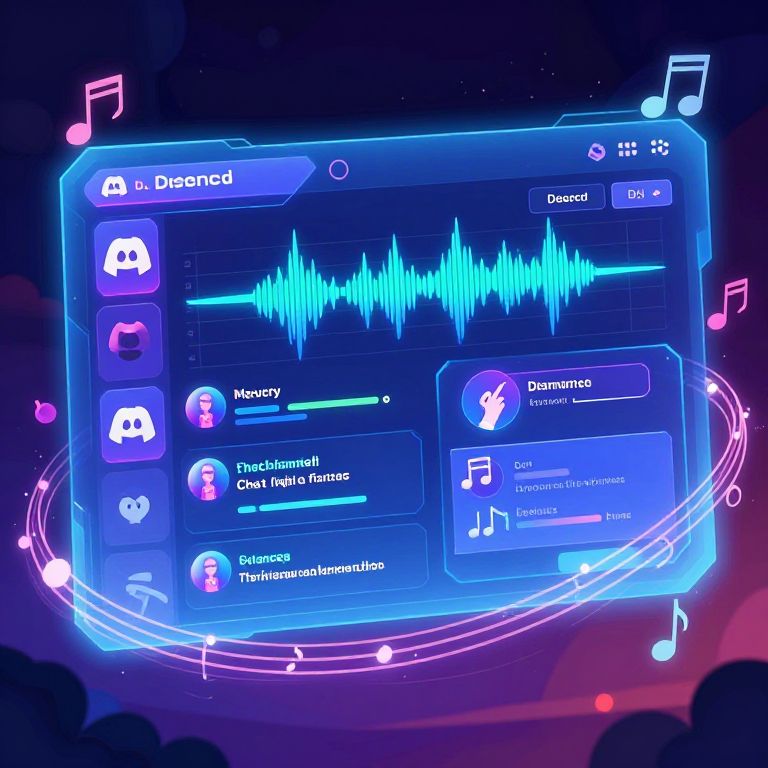 A lively illustration of a Discord harmony bot managing multiple chat channels with colorful sound waves and harmonious musical notes swirling around, futuristic holographic display, engaging and intuitive interface, vibrant fantasy colors.
