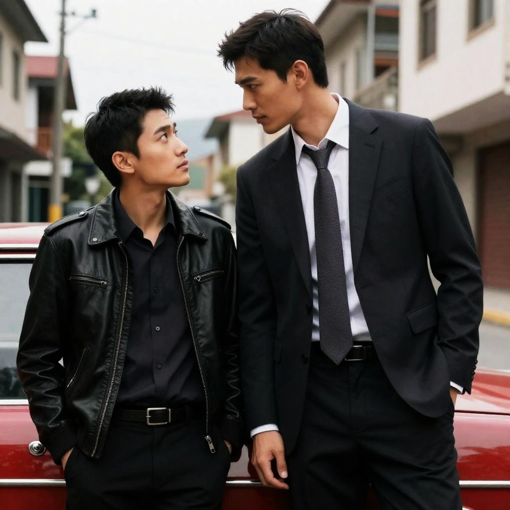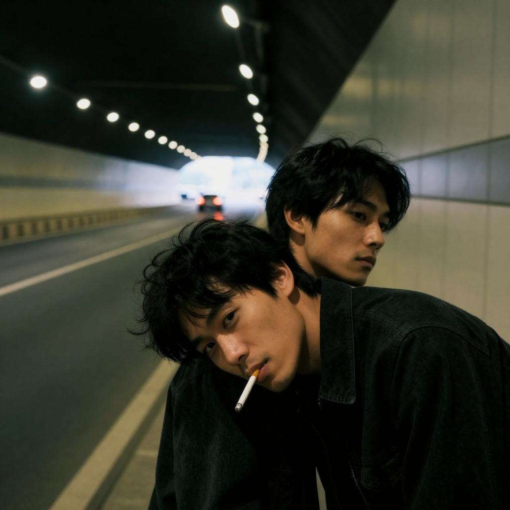 Photograph of two Asian men with black hair in a dark tunnel. The man in the foreground, with a cigarette in his mouth, leans forward, while the man behind him rests his head on the first man's shoulder. A car's headlights illuminate the tunnel's road in the background.