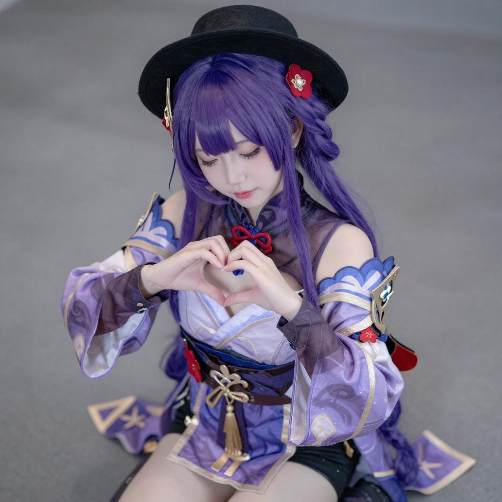 Photograph of a cosplayer with purple hair, red eyes, and pale skin, partially hidden behind a gray panel. She wears a blue cape with gold trim, red floral accents, and a black headpiece. Her right arm, adorned with white lace and red ribbons, is raised, revealing a beige, strapless top. Her expression is soft and slightly shy.