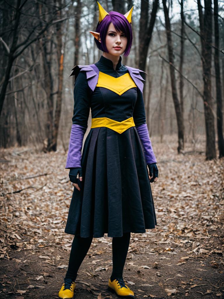 Photo-realistic cosplay photo of person in amity blight costume. 1girl, pointy ears, yellow eyes, purple hair, short hair, brown hair. full body shot