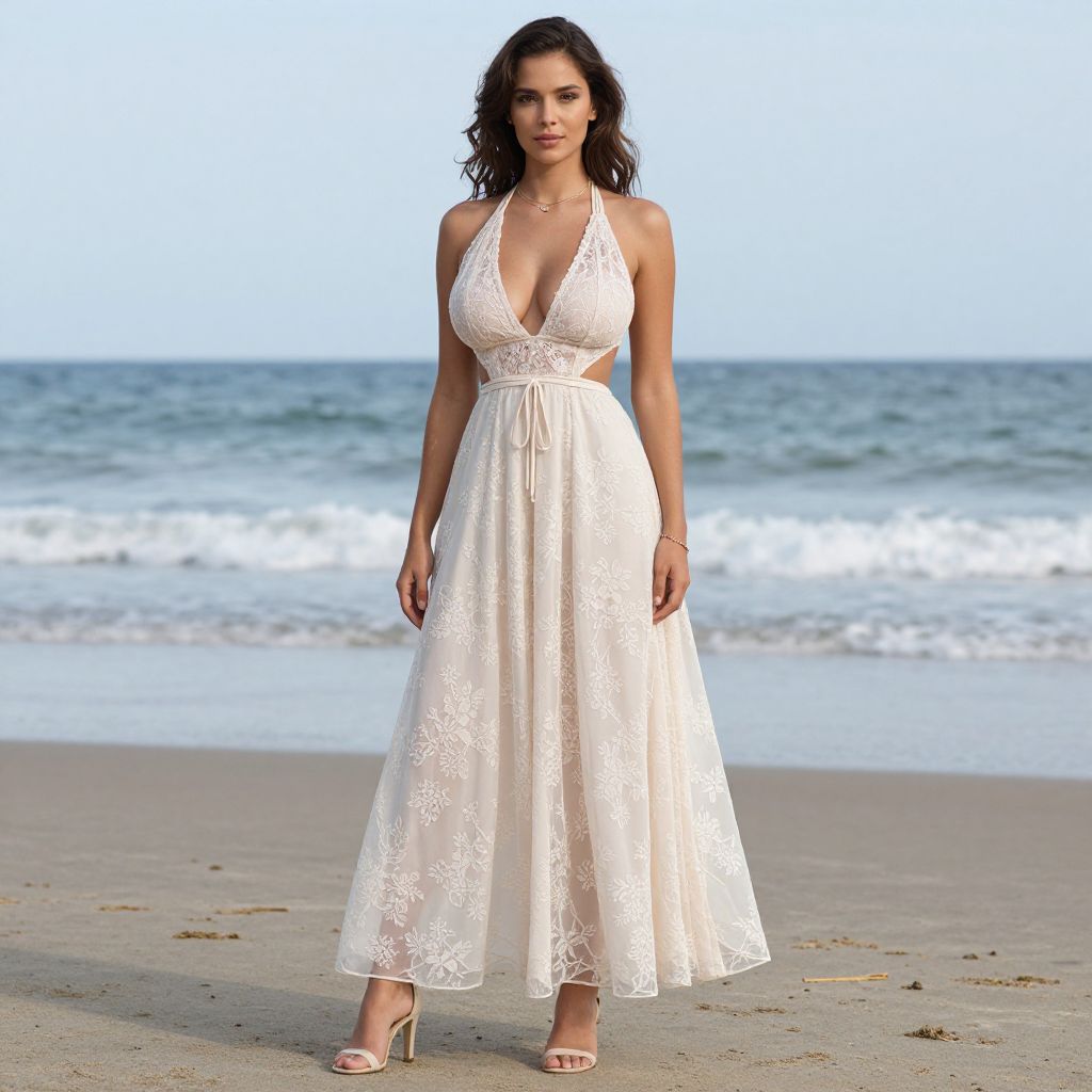 Full body shot, svelte woman, lace-up halter dress, deep V neckline, intricate lace detailing, fitted bodice, flowing A-line skirt, lightweight chiffon fabric, soft pastel color, delicate floral patterns, open back design, adjustable lace ties, ankle-strap heels, minimalistic jewelry, dainty gold necklace, matching bracelet, tousled beach waves, natural makeup, sun-kissed glow Sexy. Pretty face and beаutiful eyes. Big breasts