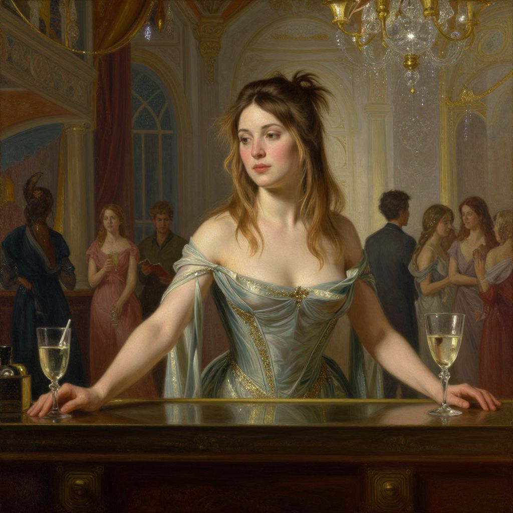A beautiful, slender woman with sandy dark blonde hair, wearing an elven dress, serves drinks behind a bar in a magical, glittering, grand ballroom, with messy sideswept hair, a flat chest, arms, and shoulders, in an ethereal, dreamy oil on canvas painting by Roberto Ferri, in a realistic baroque romantic, chiaroscuro, neoclassical, classical realism, hyper-realism style.