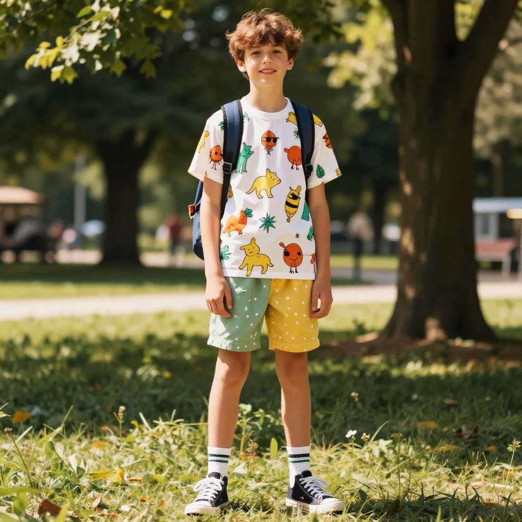 Full-length fashion-forward portrayal of a teenage boy in playful prints styled by Lotta Volkova, standing in a sunny park, with joyful styling.