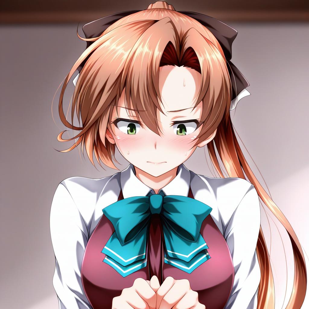 Digital illustration of an anime girl with long brown hair tied in a ponytail with a hair ribbon, wearing a school uniform featuring a white shirt, maroon vest, and a large teal bow. The character has green eyes, a mole under one eye, and a slightly blushing, nervous expression. The style is influenced by the KanColle series, specifically the character Akigumo Kai Ni.