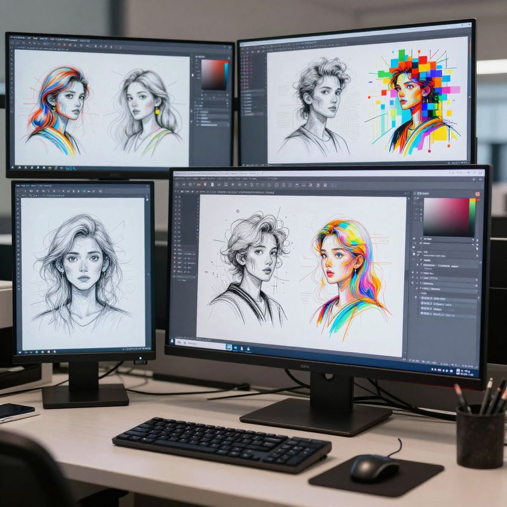 AI image drawing capturing a creative workspace with multiple screens displaying evolving digital sketches, an AI interface generating new art strokes autonomously, filled with colorful pixels, matrix codes, and a sense of artistic innovation and technology fusion.