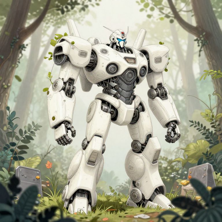 Transformer drawings featuring a sleek, agile robot in a forest environment, blending organic shapes with mechanical design, foliage intertwining with metal plates, soft diffused natural lighting, highly detailed line work and subtle color gradients.