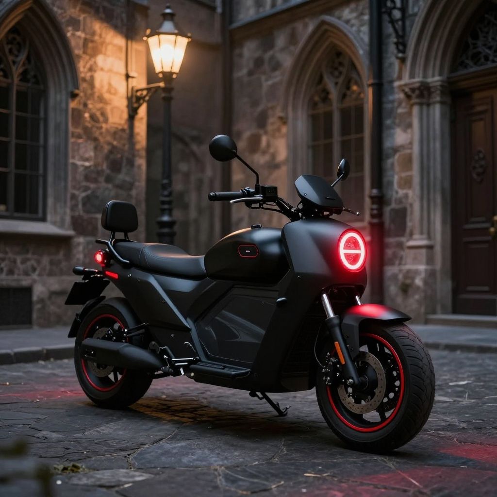 A vintage batimobil redesigned with modern tech, matte black body, glowing red accents, parked under a flickering street lamp in gothic city alley, cinematic shadows