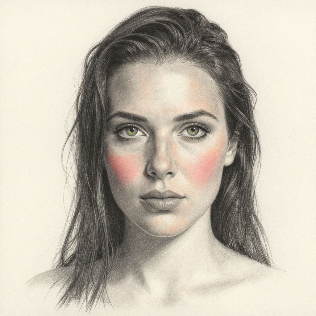 Digital portrait of a young woman with fair skin, green eyes, and brown hair, featuring detailed shading and realistic textures.